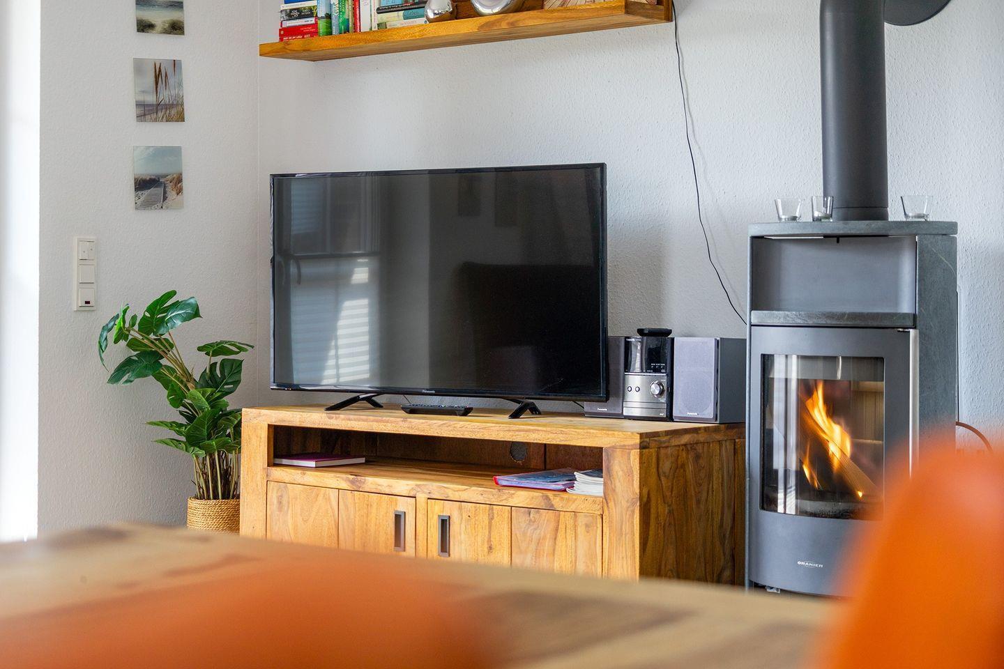 Eine gemütliche Couchgarnitur im großzügigen Wohnbereich mit großem Fernseher, eine Musik- und Radioanlage...ein Kaminofen sorgt an kühleren Tagen für eine kuschelige Wärme.
