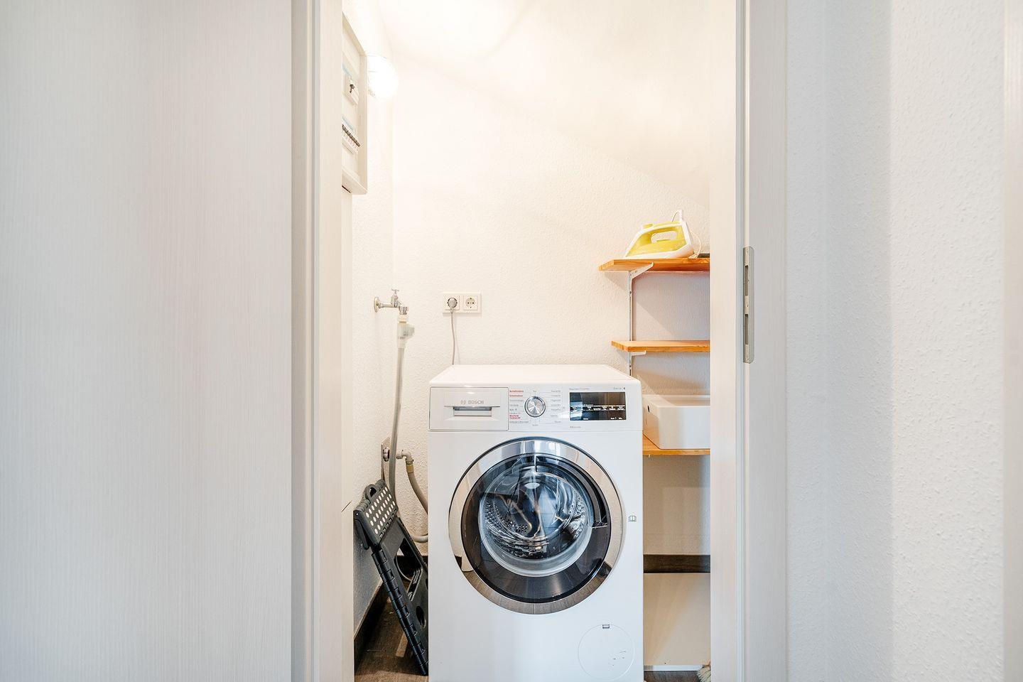 Die Wohnung verfügt auch über ein Gäste-WC. Des Weiteren sind ein Bügelbrett, ein Bügeleisen und ein Wäscheständer vorhanden.