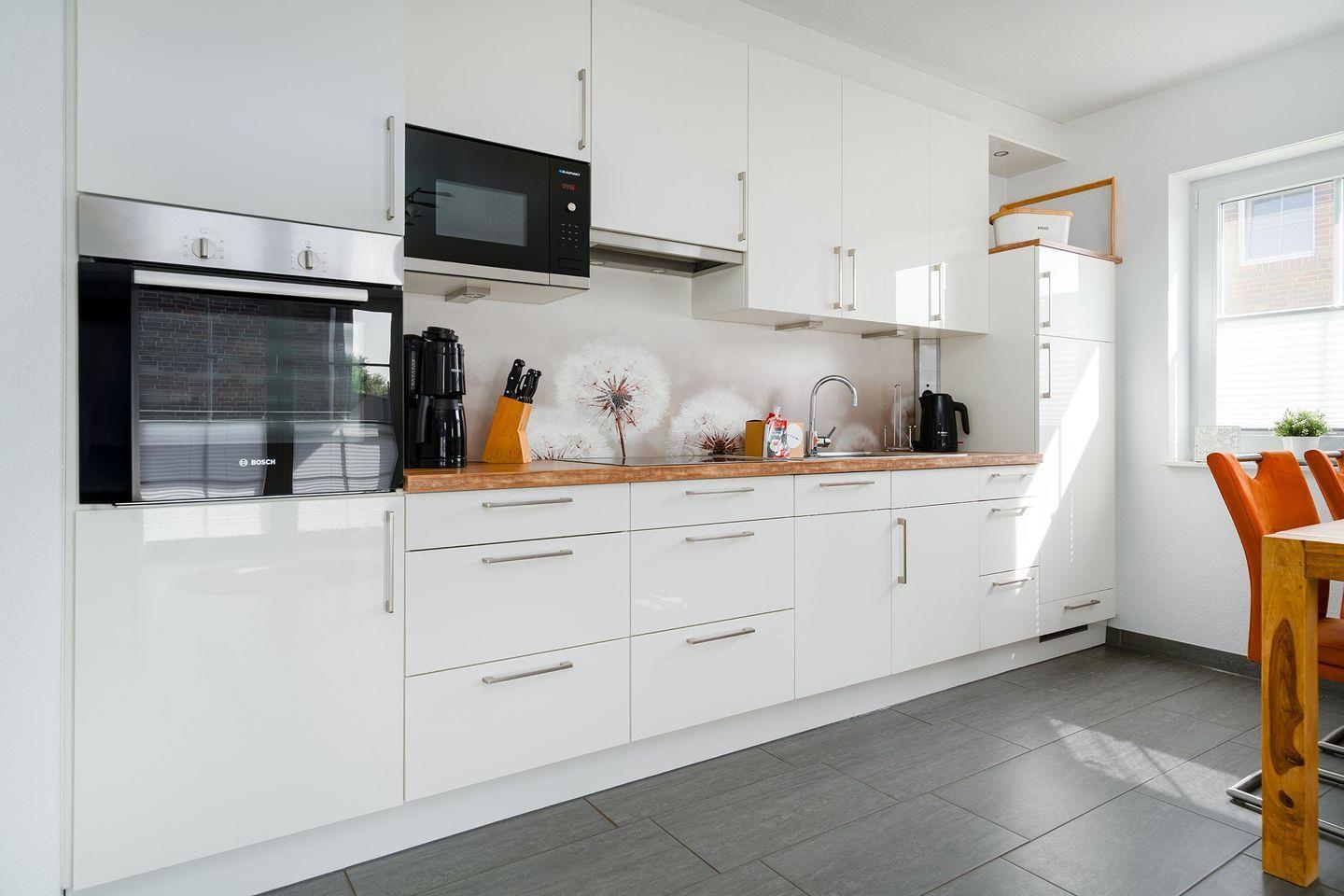 Die moderne Küche bietet eine reichhaltige Ausstattung, z.B. Backofen, Mikrowelle, Kühlschrank mit zwei Gefrierfächern, Geschirrspülmaschine, Senseo-Kaffeepadmaschine, Toaster, Wasserkocher, Eierkocher, Mixer u.v.m.