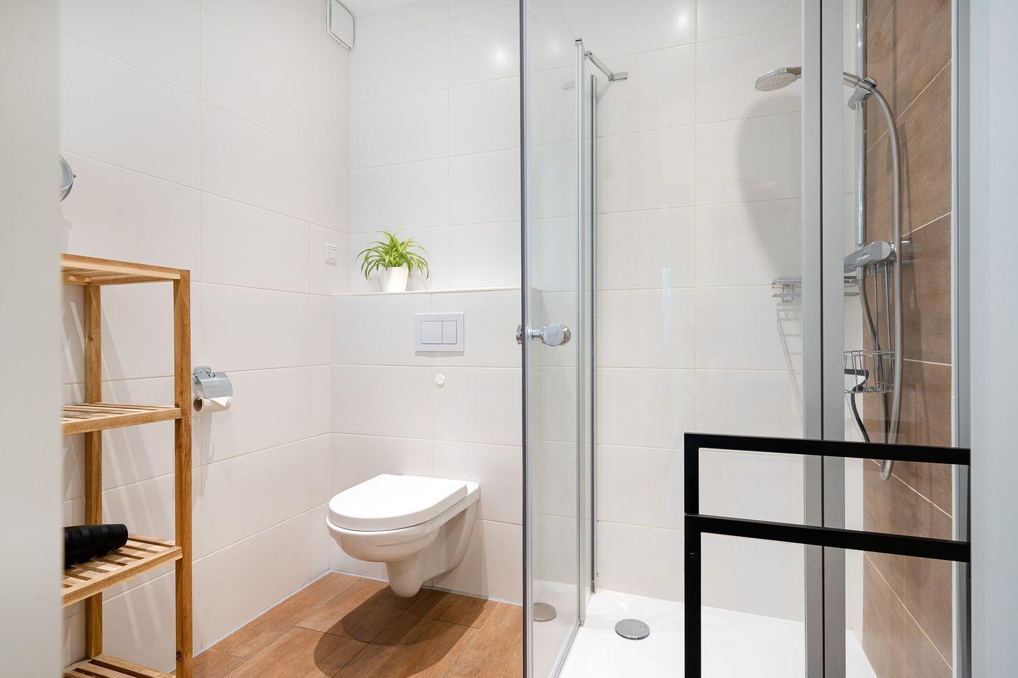 Das moderne Bad ist mit einer ebenerdigen Regendusche und Ganzglasduschtür ausgestattet. Ein Fön ist ebenfalls vorhanden. Zusätzlich gibt es ein separates Gäste-WC mit Waschbecken.