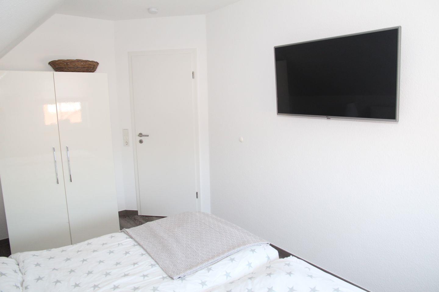 Die Deichbude ist mit allem Komfort ausgestattet, es bleiben keine Wünsche offen. Sie verfügt über insgesamt 3 Schlafzimmer, wobei sich eines auf der oberen Galerie befindet. Ein Schlafzimmer auf der 1. Etage ist mit einem Doppelbett ausgestattet, die anderen beiden mit jeweils zwei Einzelbetten, die auch zusammen gestellt werden können. Die Fußböden sind mit einem Vinylboden in Holzoptik ausgestattet und verfügen über eine angenehme Fußbodenheizung. Die Fenster lassen sich alle abdunkeln. In jedem Schlafzimmer befindet sich ein Smart-TV.