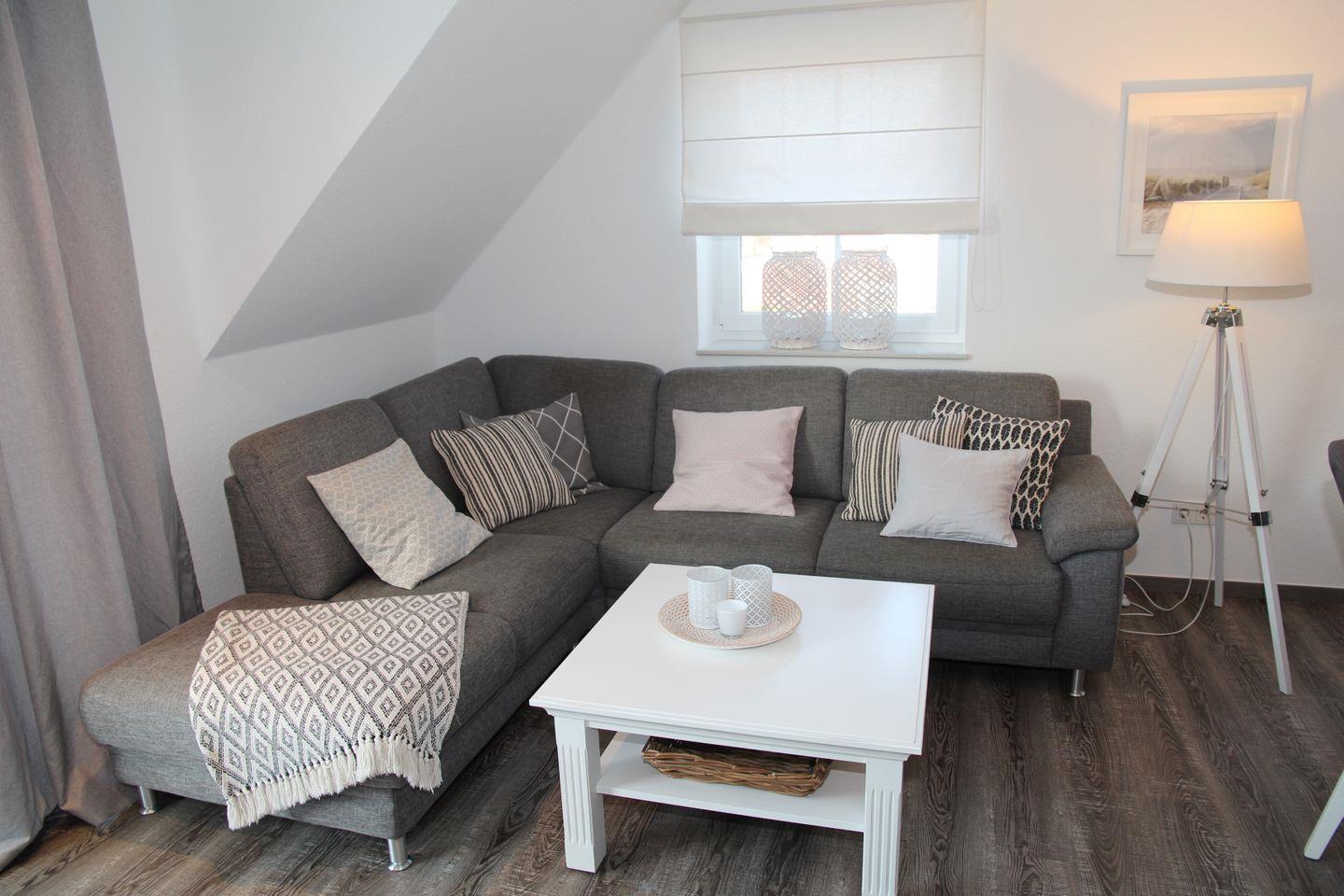 Der Wohnbereich mit seinem bequemen Ecksofa und Sessel lädt zu gemütlichen Spieleabenden ein. Auch hier sorgt ein Smart-TV für beste Unterhaltung.