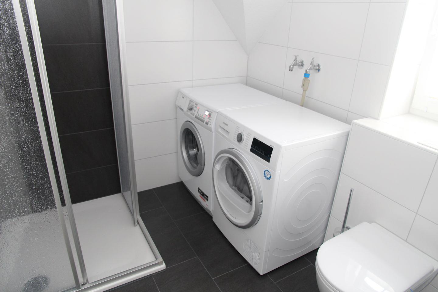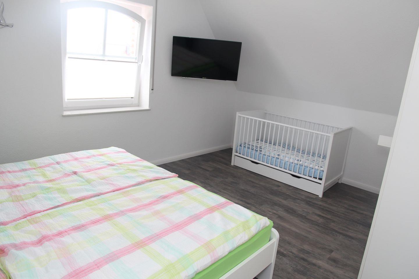 Im Obergeschoss befinden sich zwei gemütliche Schlafzimmer (eines mit Doppelbett, Kleiderschrank, Kinderbettchen und Wickelkommode, das andere mit 2 Einzelbetten/Kleiderschrank) und ein weiteres Badezimmer mit Dusche, Babybadewanne, Waschmaschine und Trockner. Die Treppe ist mit einem Treppenschutzgitter gesichert.