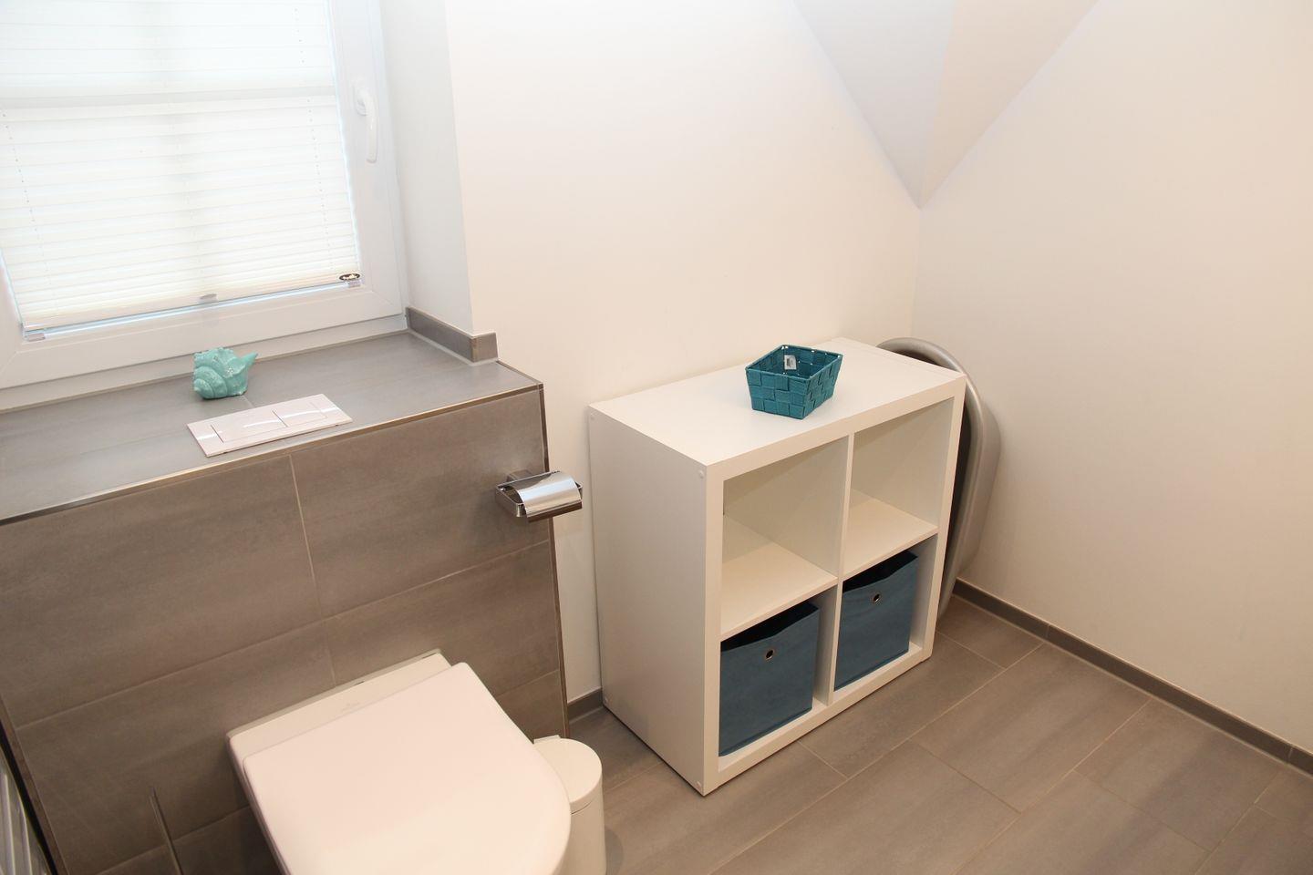 Im Obergeschoss sind zwei gemütliche Schlafzimmer (beide mit Doppelbett und Kleiderschrank) sowie ein weiteres Badezimmer mit Dusche, Babybadewanne, Wickelauflage, Waschmaschine und Trockner.