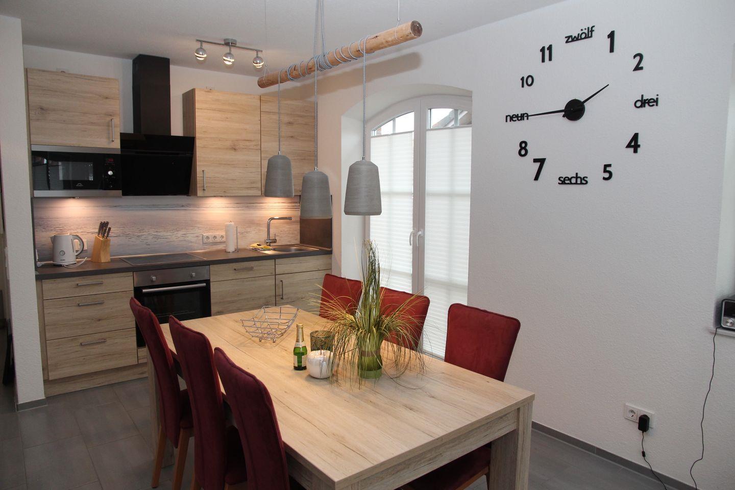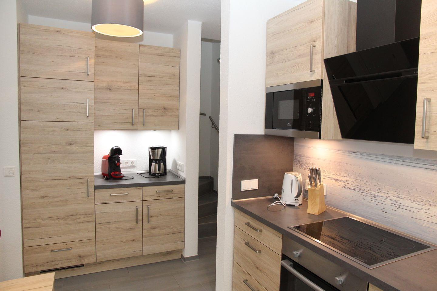 Im Erdgeschoss befindet sich ein Wohn-Essbereich mit moderner, komplett ausgestatteter Küche mit Geschirrspülmaschine, Kühlschrank, separatem Gefrierfach, Mikrowelle, Cerankochfeld mit Induktion, Wasserkocher, Kaffeemaschine, Padmaschine (Tassimo/Bosch), Toaster, Mixer, Eierkocher u.v.m. Ein großer Esstisch mit 6 Stühlen sowie ein Kinderhochstuhl stehen für gemütliche Familienzusammenkünfte zur Verfügung. Der Kaminofen lädt zu gemütlichen Abenden und ruhigen Stunden ein. Im EG ist weiterhin ein kleines Badezimmer mit Dusche sowie ein kleines Schlafzimmer mit zwei Einzelbetten und Kleiderschrank.