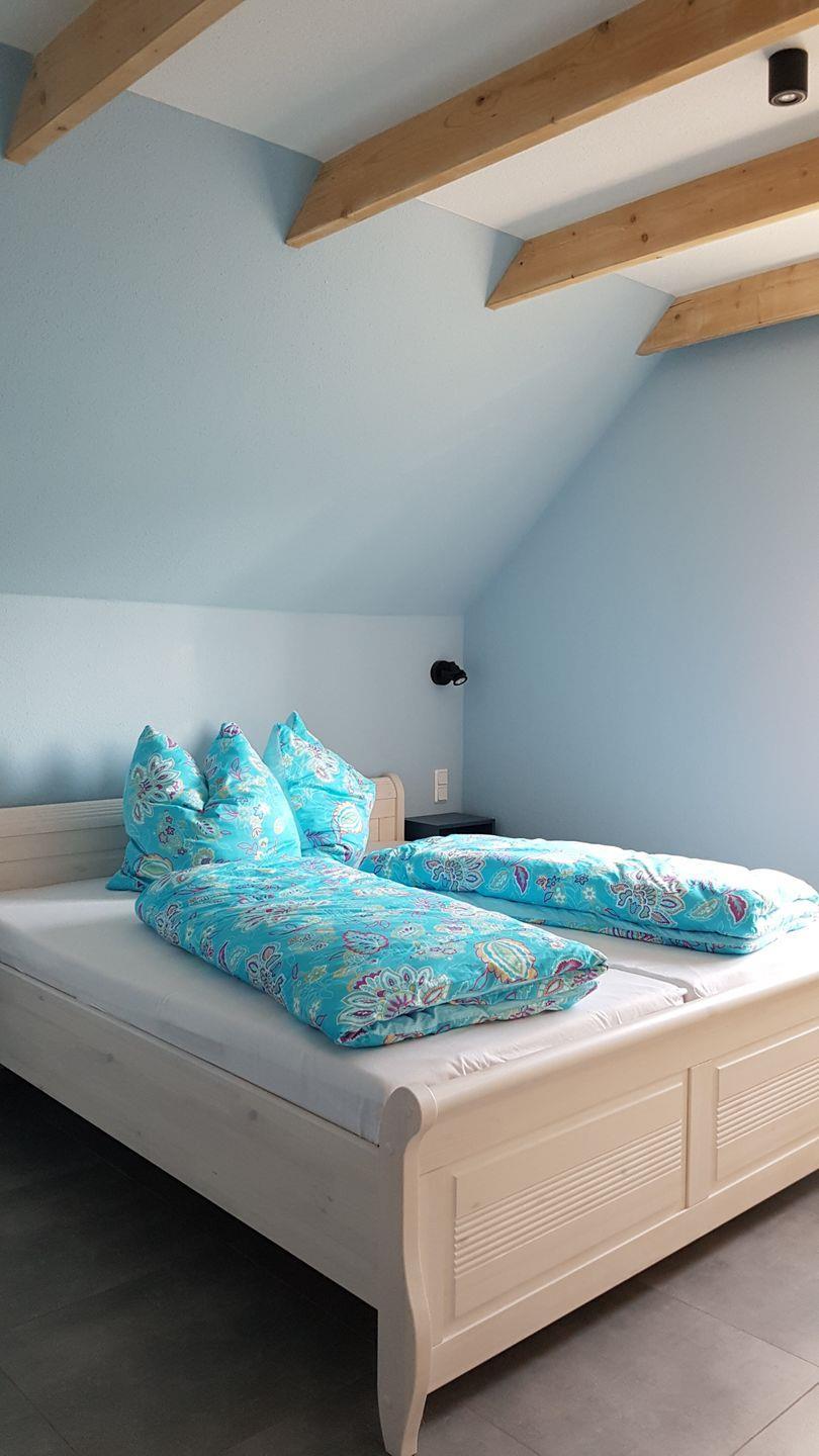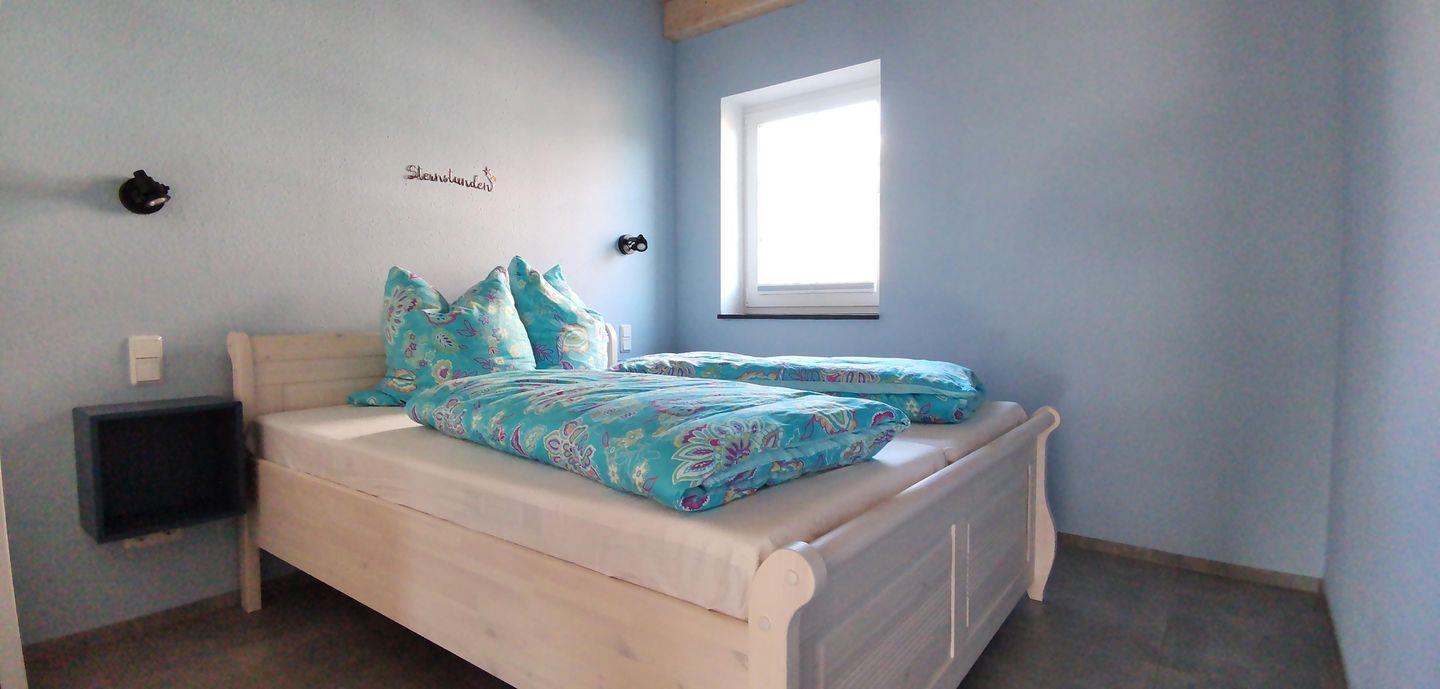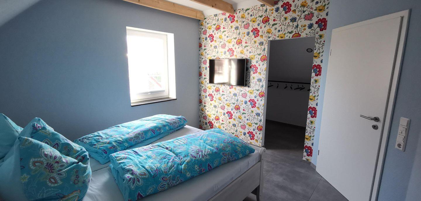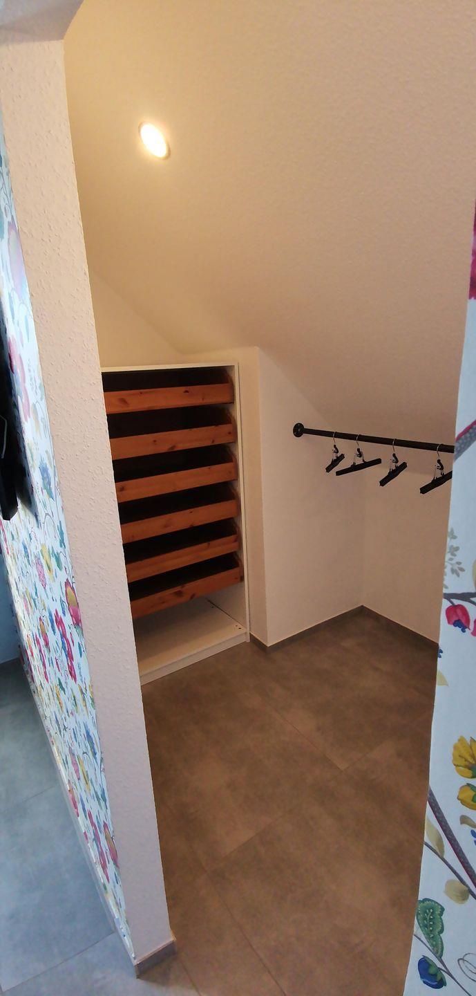 Eine offene Holztreppe führt vom Wohnbereich in den 1. Stock, der Ihnen ein 2. Duschbad mit Föhn und Waschmaschine und zwei weitere charmante Schlafzimmer offeriert. Eines der Schlafzimmer besitzt ein großes Doppelbett (2 getrennte Matratzen mit je 90 x 200 cm), einen 3. Smart-TV und eine angrenzende begehbare Kleiderkammer. Das dritte Schlafzimmer ist mit einem französischen Doppelbett (Matratzengröße 140 cm) und 2 kleinen Kleiderschränken sowie einem gemütlichen Sessel eingerichtet. Ein Reisekinderbettchen für die kleinen Gäste ist in einem kleinen Abstellraum, in dem Sie auch Ihre Koffer unterbringen können, vorhanden.