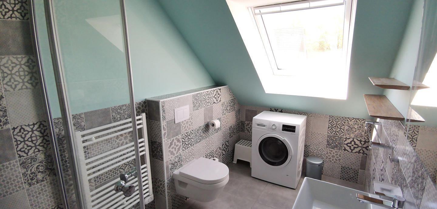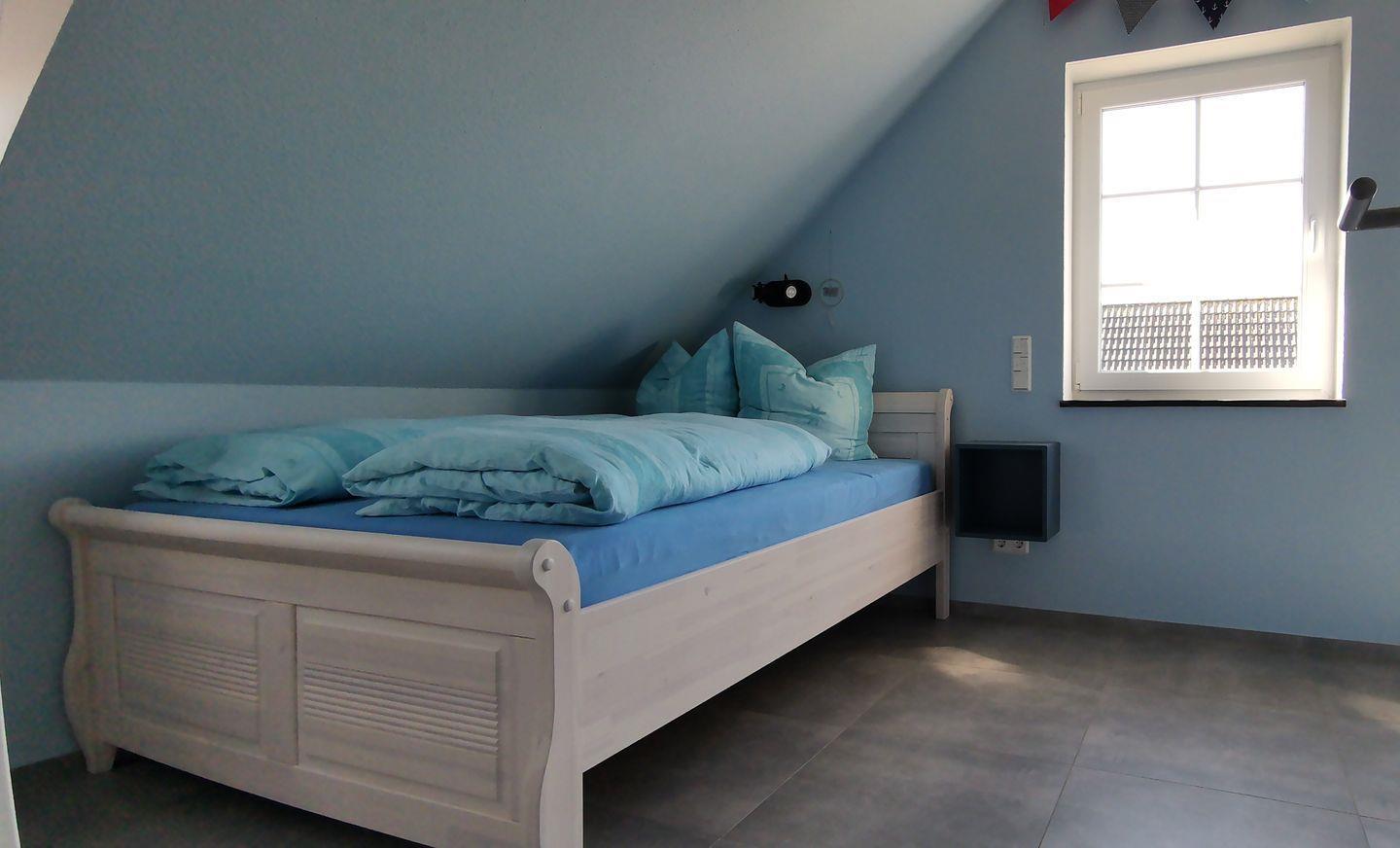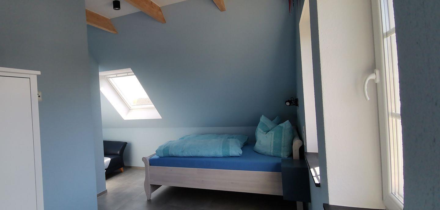 Eine offene Holztreppe führt vom Wohnbereich in den 1. Stock, der Ihnen ein 2. Duschbad mit Föhn und Waschmaschine und zwei weitere charmante Schlafzimmer offeriert. Eines der Schlafzimmer besitzt ein großes Doppelbett (2 getrennte Matratzen mit je 90 x 200 cm), einen 3. Smart-TV und eine angrenzende begehbare Kleiderkammer. Das dritte Schlafzimmer ist mit einem französischen Doppelbett (Matratzengröße 140 cm) und 2 kleinen Kleiderschränken sowie einem gemütlichen Sessel eingerichtet. Ein Reisekinderbettchen für die kleinen Gäste ist in einem kleinen Abstellraum, in dem Sie auch Ihre Koffer unterbringen können, vorhanden.