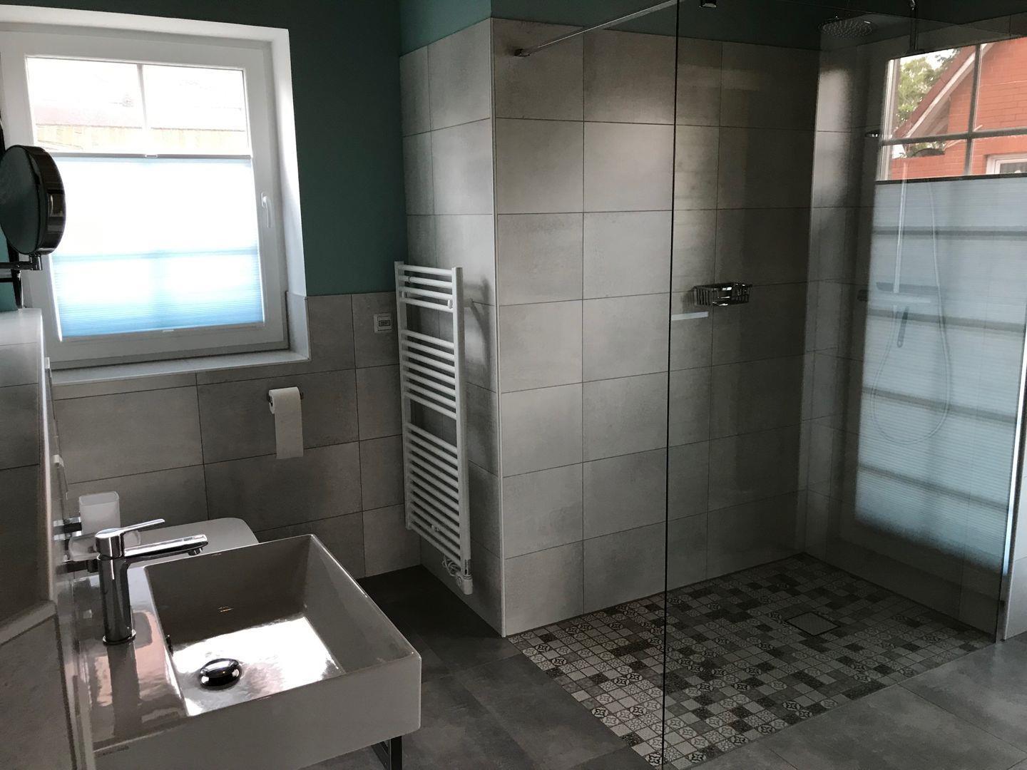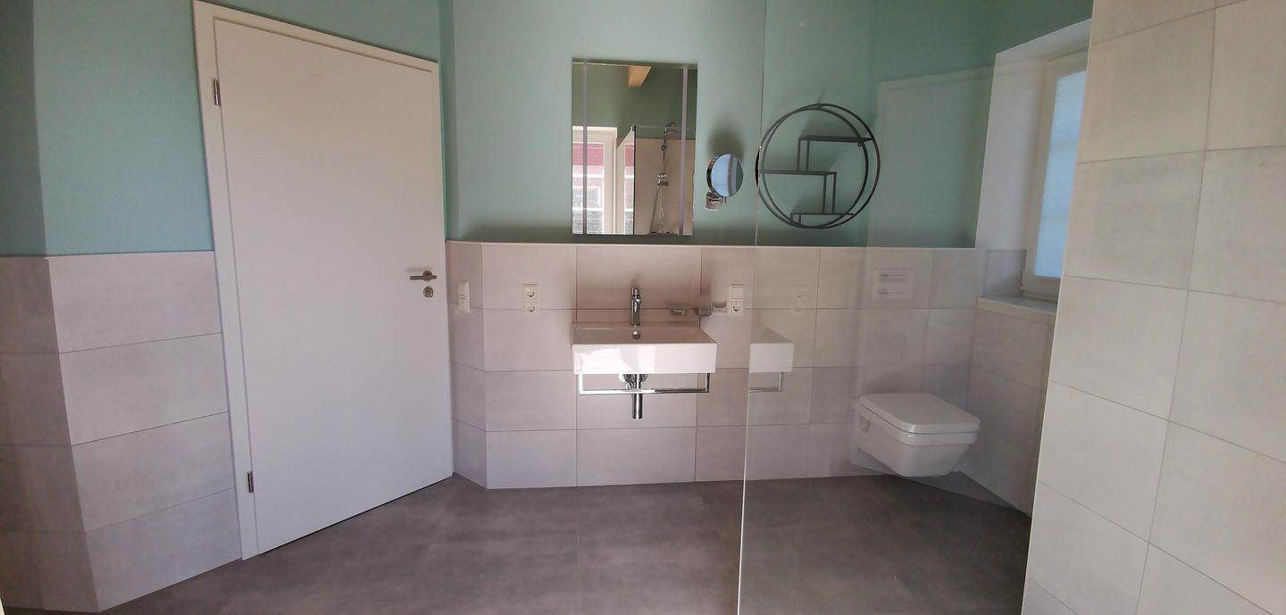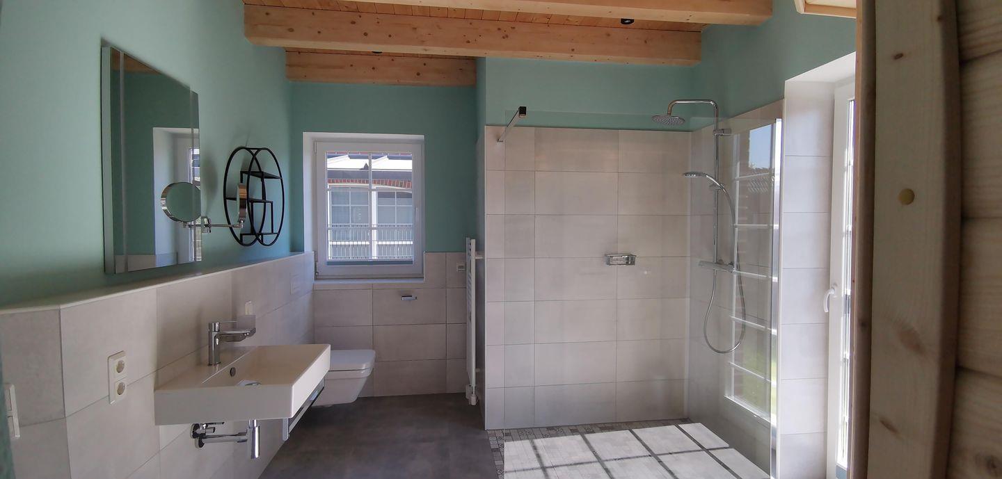 Ein großzügiges komfortables Duschbad mit ebenerdiger 150 cm langen Walk-In-Dusche mit Regenbrause, Sauna, Kosmetikspiegel und Föhn, sowie ein Schlafzimmer mit Doppelbett (2 getrennte Matratzen à 80 x 200 cm), Kleiderschrank und 2. Smart-TV runden das schöne Ambiente im Erdgeschoß ab. Wichtig für Menschen mit Handicap, die keine Treppen steigen möchten.
