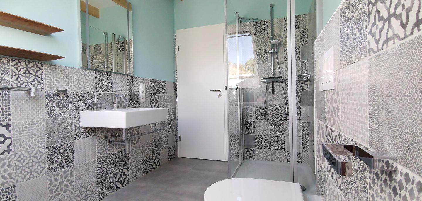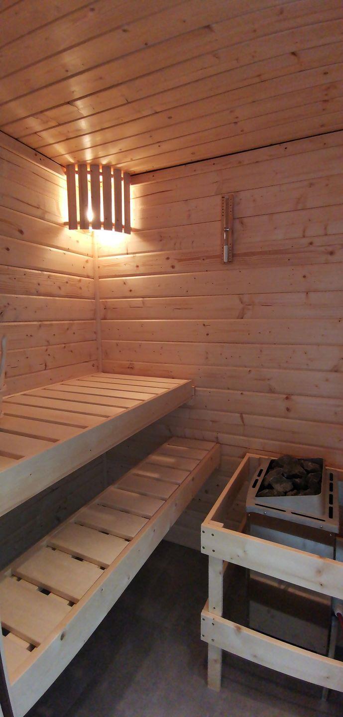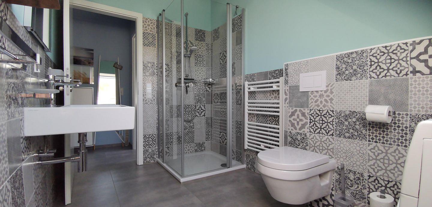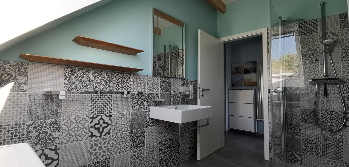 Ein großzügiges komfortables Duschbad mit ebenerdiger 150 cm langen Walk-In-Dusche mit Regenbrause, Sauna, Kosmetikspiegel und Föhn, sowie ein Schlafzimmer mit Doppelbett (2 getrennte Matratzen à 80 x 200 cm), Kleiderschrank und 2. Smart-TV runden das schöne Ambiente im Erdgeschoß ab. Wichtig für Menschen mit Handicap, die keine Treppen steigen möchten.
