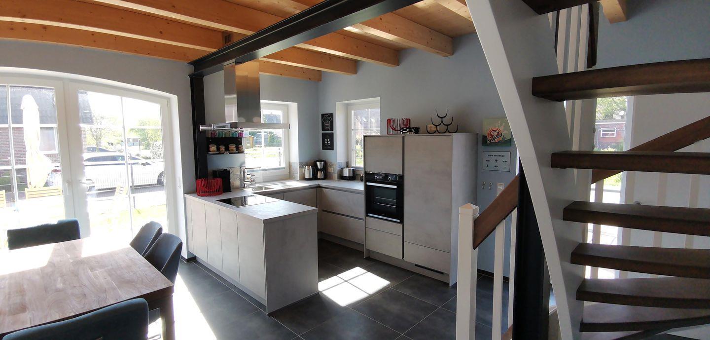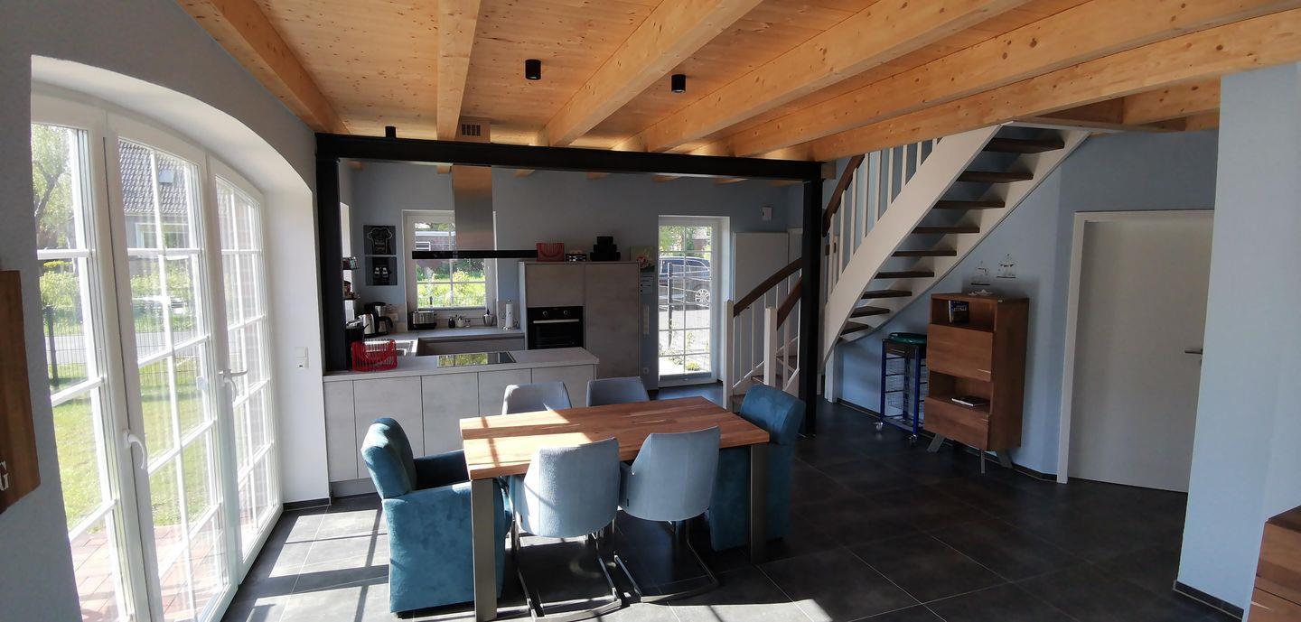 Durch den geschmackvollen Eingangsbereich kommen Sie in die Küche mit angrenzendem lichtdurchfluteten und behaglichen Ess- und Wohnbereich mit Holzbalkendecke. Die top-moderne Küche verfügt über Ceranfeld, Backofen, Kühlschrank mit Gefrierfach, Mikrowelle, Toaster, Wasserkocher, Kaffeemaschine und eine Senseo-Padmaschine. Am großen Esstisch finden bequem 6 Personen