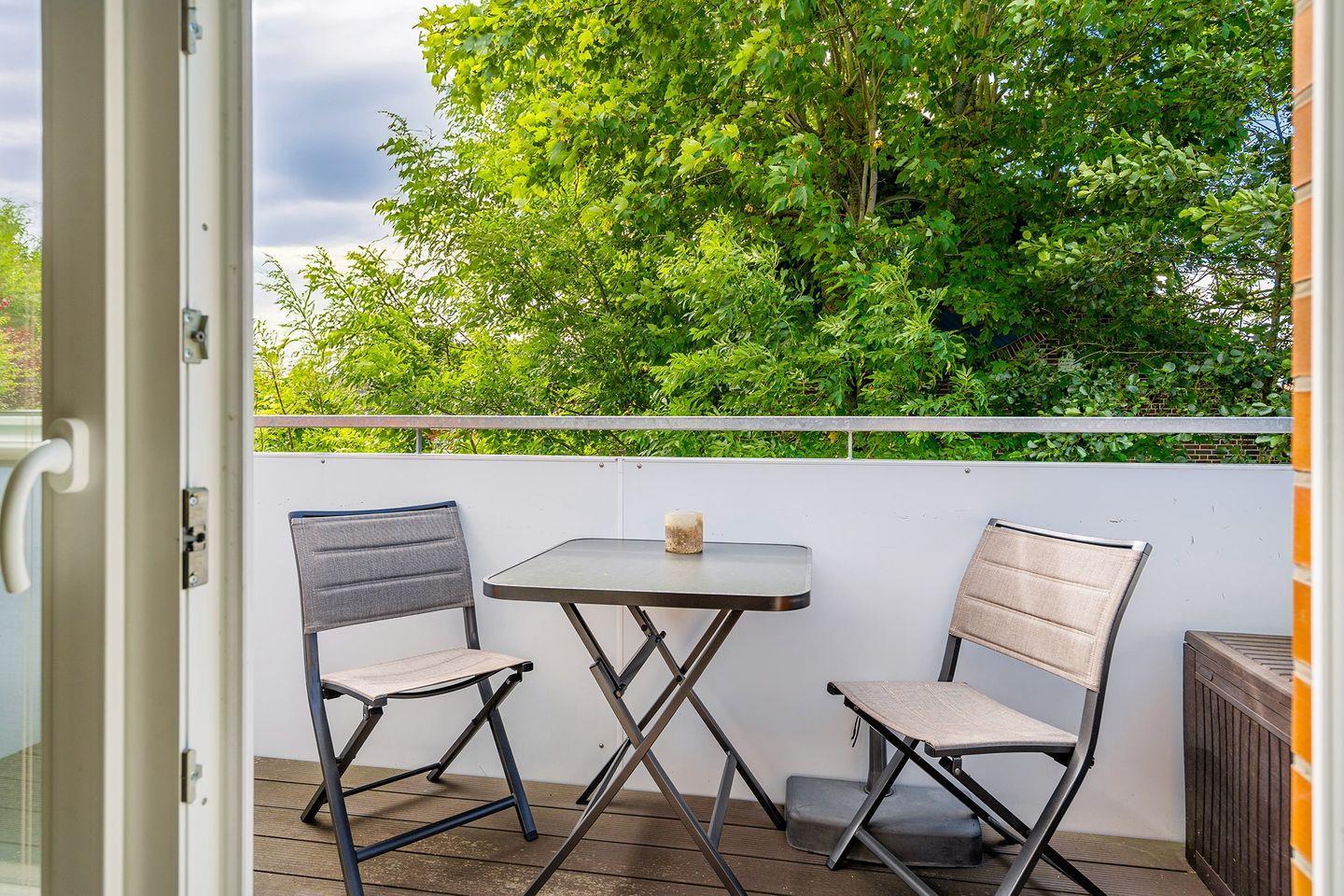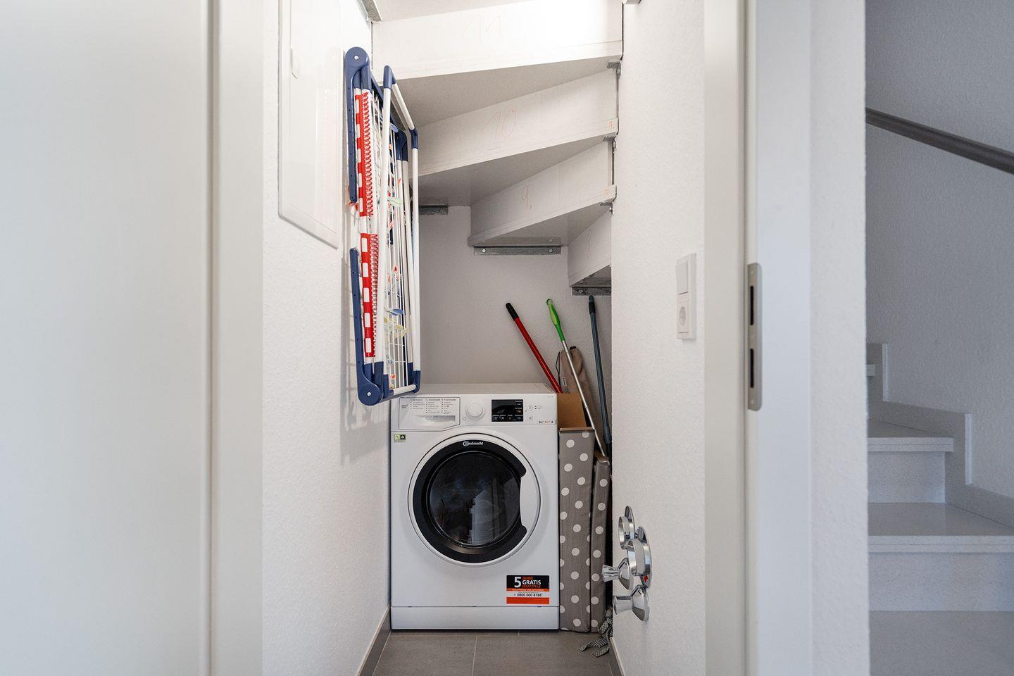 Ein Waschtrockner, ein Bügelbrett sowie ein Bügeleisen stehen bereit. Der Balkon ist mit vier Stühlen und zwei Hockern für die Füße möbliert, ein Sonnenschirm ist auch vorhanden. Alle Fenster sind mit Fliegengittern versehen.
