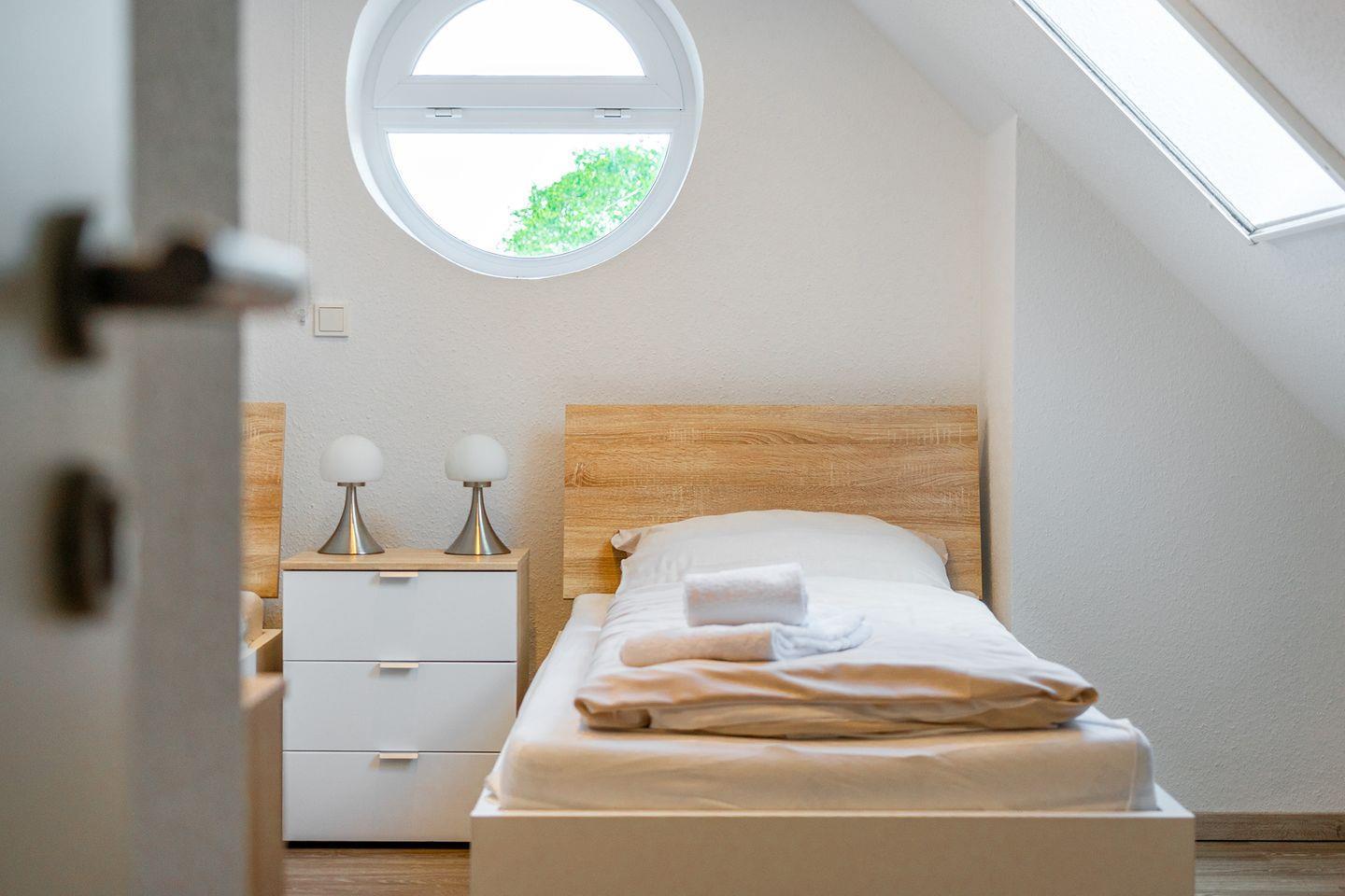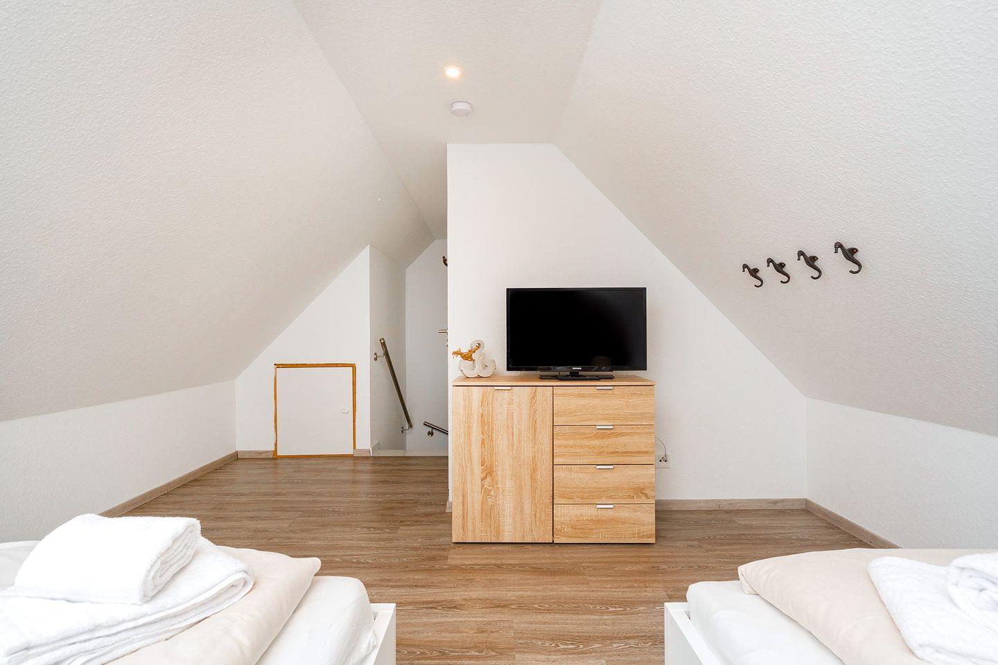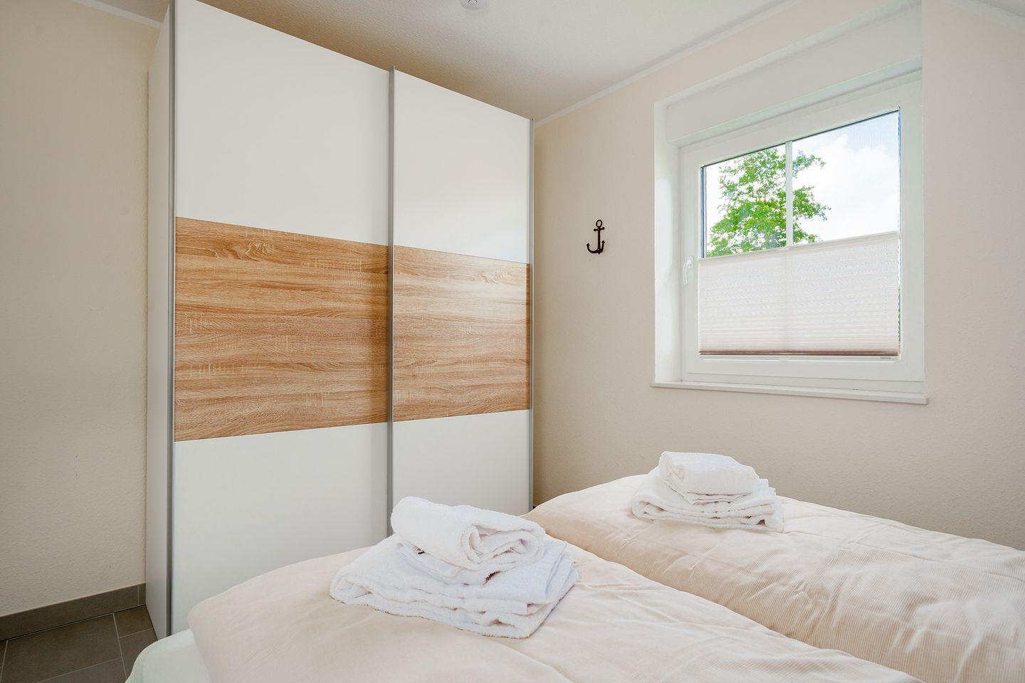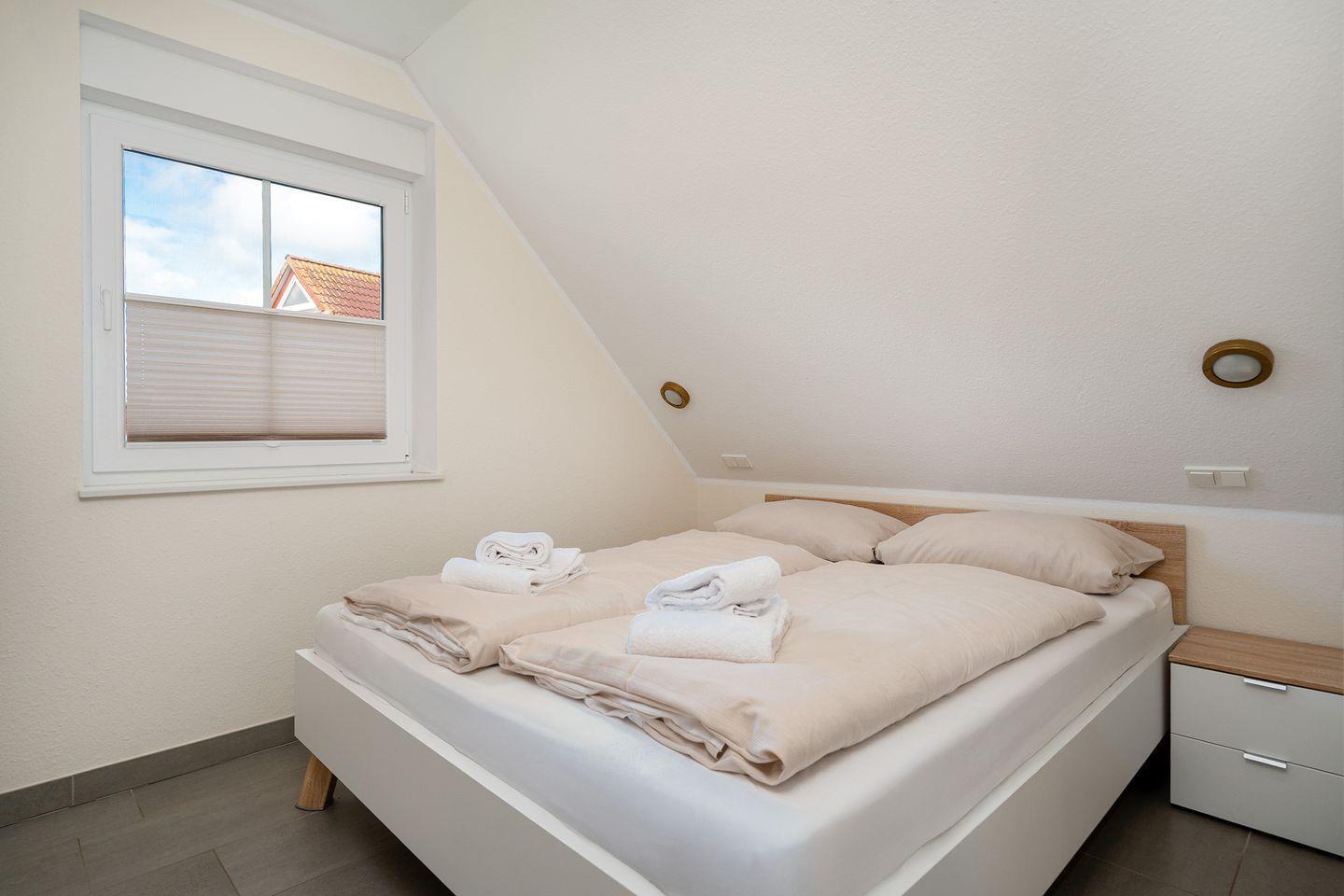 Das Schlafzimmer verfügt über ein Doppelbett (1,60 x 2,00 m) und einen Kleiderschrank. In dem zweiten Schlafzimmer im Dachstudio befinden sich zwei Einzelbetten (0,90 x 2,00 m) sowie eine Kommode. Die Fenster im Obergeschoss wurden mit elektrischen Jalousien ausgestattet, im Dachstudio ist ein Rollo zur Verdunkelung vor dem runden Fenster und dem Dachfenster.