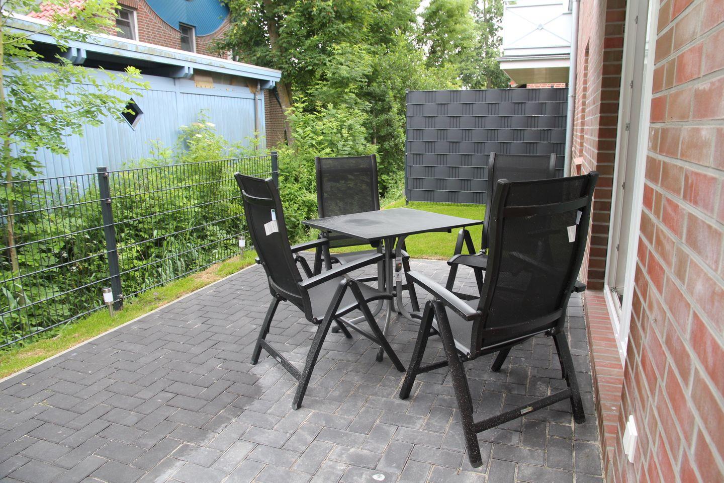 Die Terrasse ist mit einem Tisch sowie vier Stühlen möbliert.