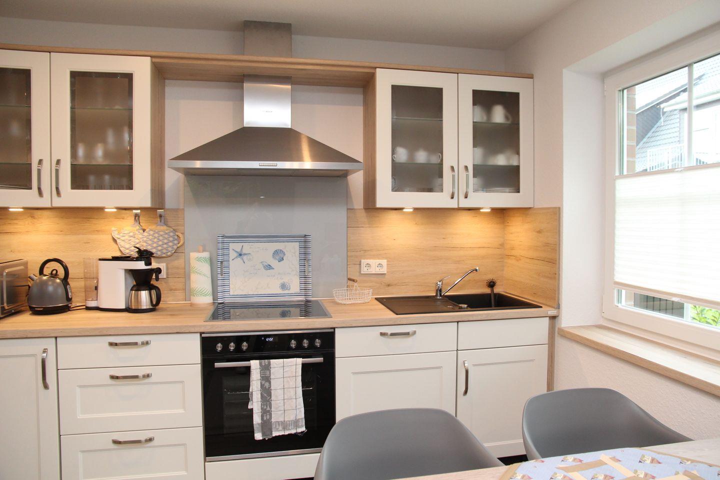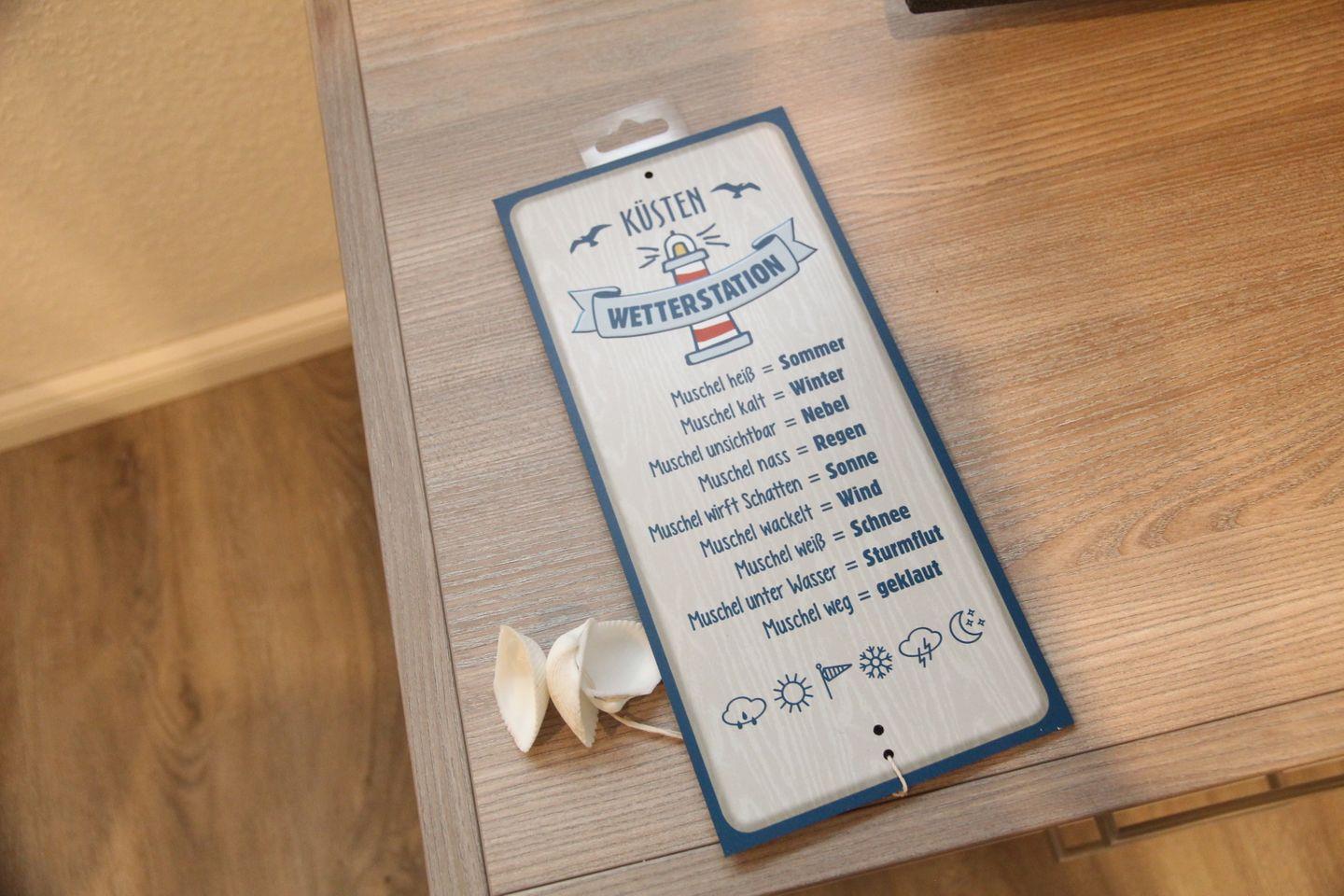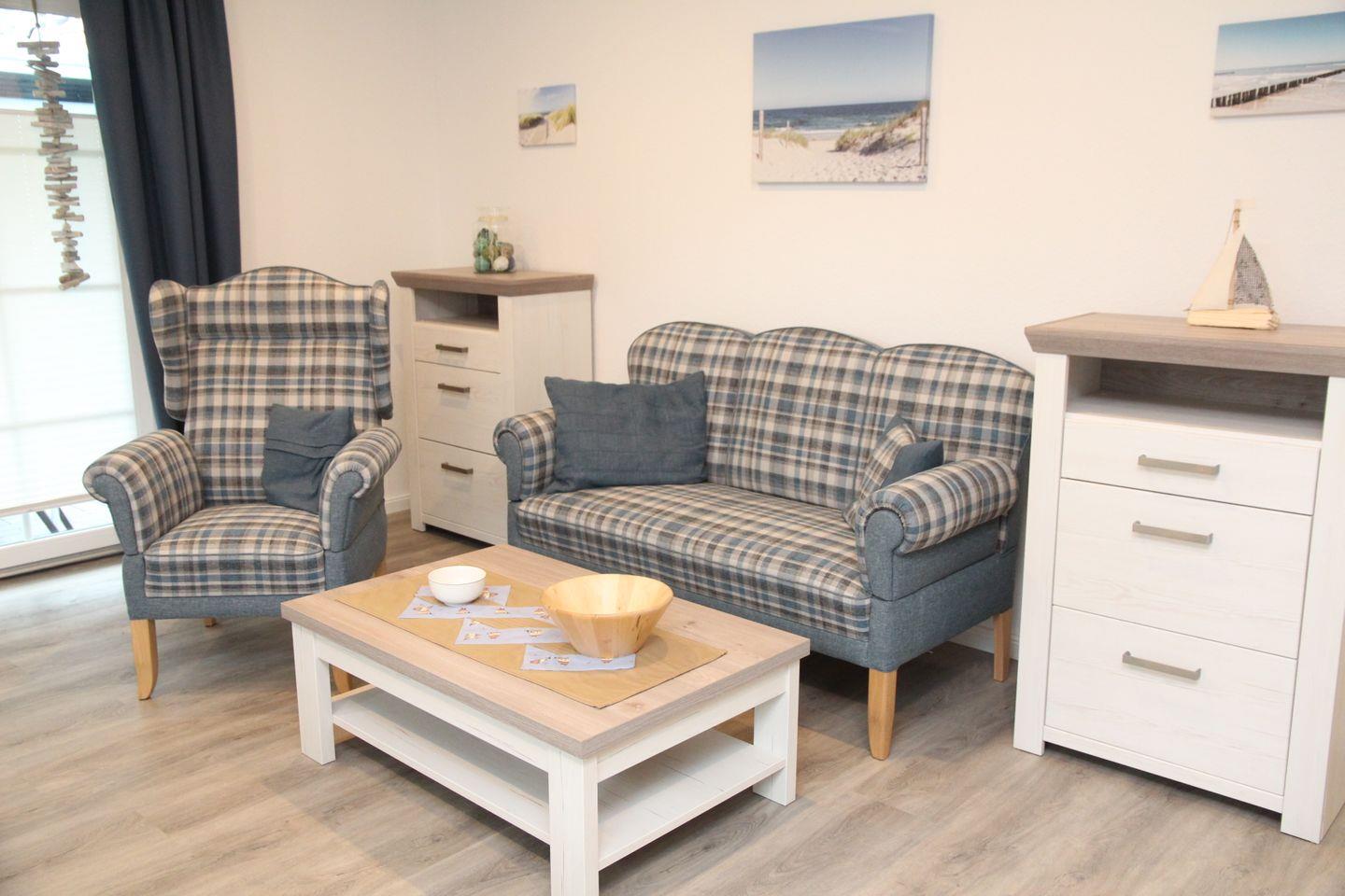 Im gemütlichen Wohnbereich finden Sie ein Friesensofa mit Sessel, Kommode und Flachbild-TV und einen Esstisch mit vier modernen Stühlen. Die hochwertige Küchenzeile bietet für Ihren Aufenthalt eine Kaffeemaschine, Mikrowelle, einen Toaster, Wasserkocher, Herd, Backofen, Kühlschrank (ohne Gefrierfach) und eine Geschirrspülmaschine.