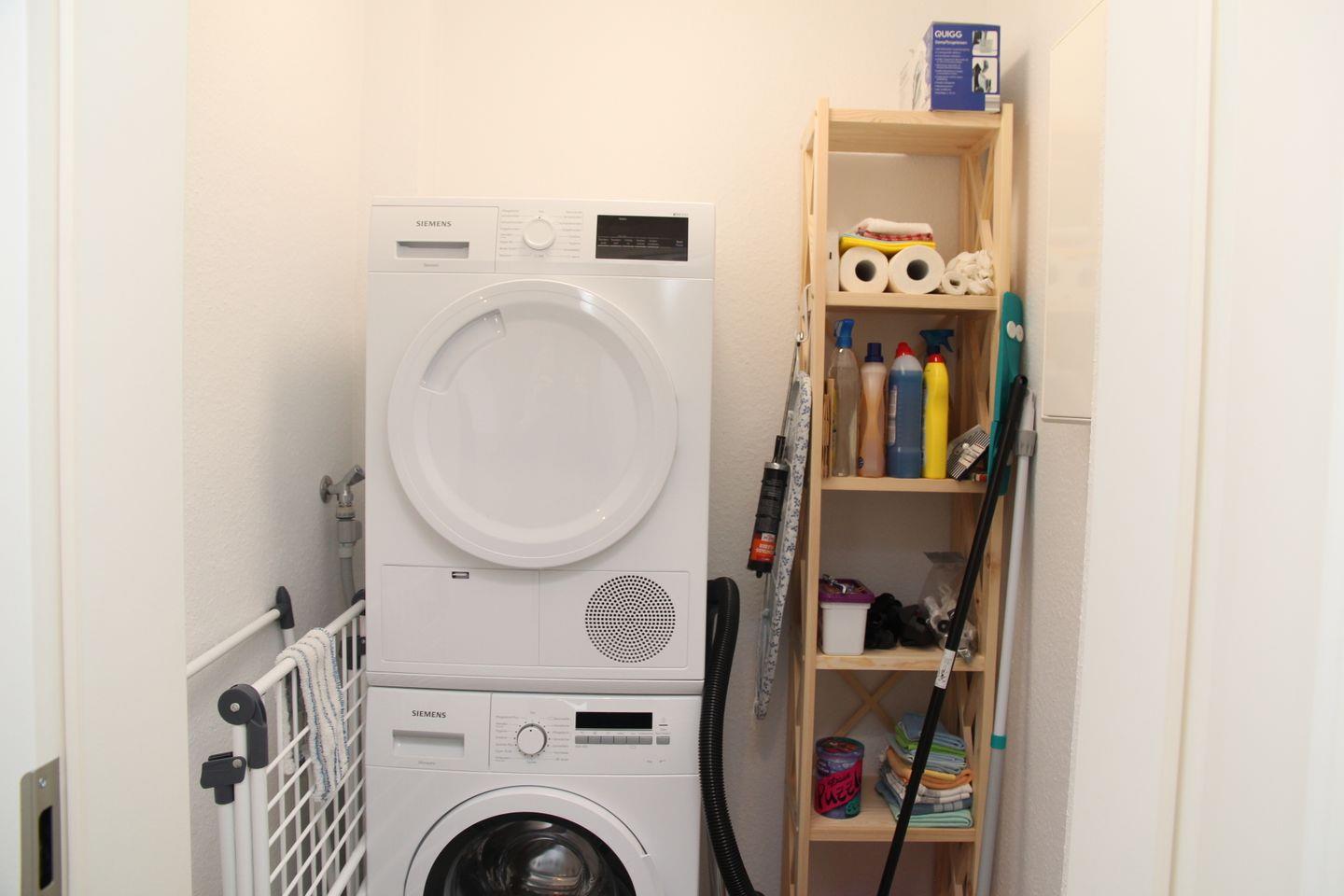 Ein Waschtrockner, ein Bügelbrett und ein Bügeleisen stehen Ihnen zur Verfügung.