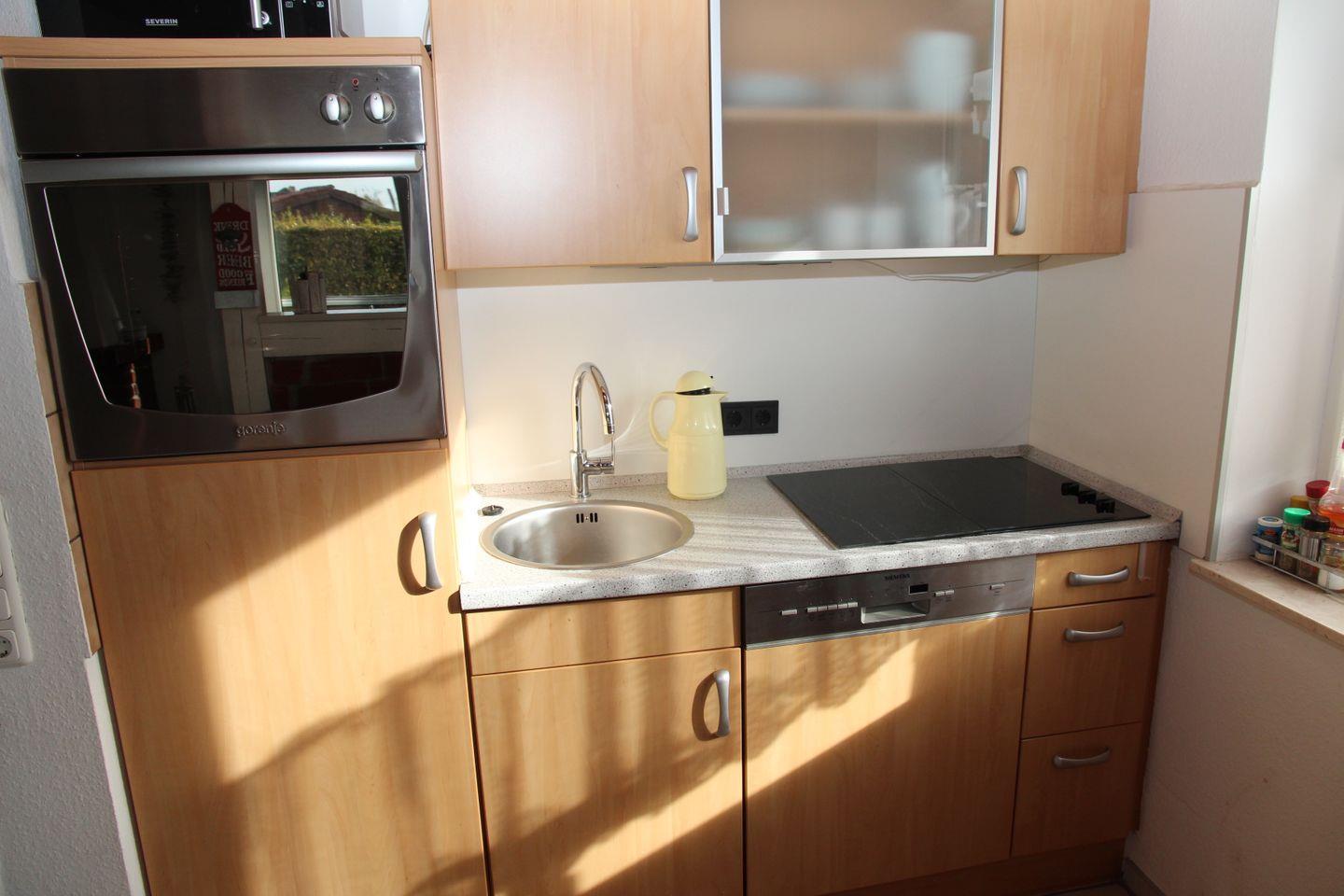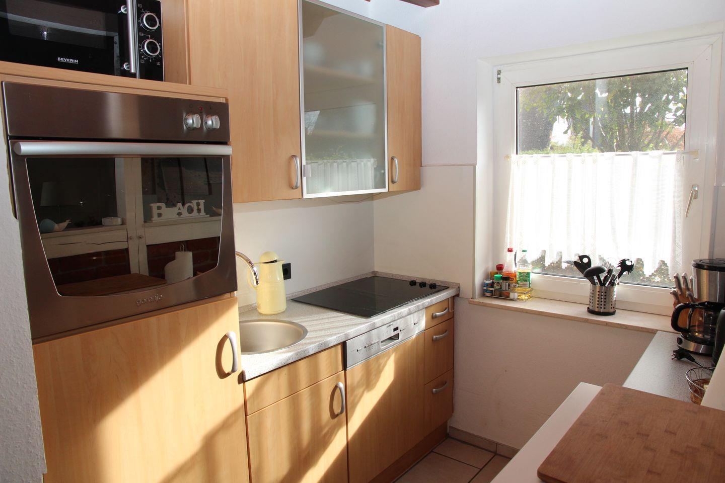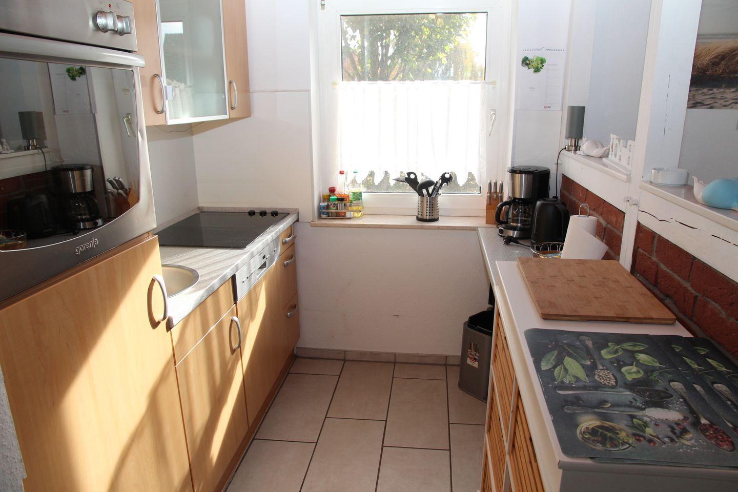 Im Erdgeschoss kommen Sie durch den Hausflur mit Garderobe in den Wohnbereich mit Küche, die über alle wichtigen Ausstattungsmerkmale wie bspw. Kühlschrank, Mikrowelle, Kaffeemaschine, kleinen Backofen, Cerankochfeld, Wasserkocher verfügt. Der Wohnbereich bietet ein gemütliches L-Sofa, einen großen Flachbildfernseher (55 Zoll), einen offenen Kamin und den Esstisch mit vier Stühlen (ein fünfter Stuhl ist im Gästezimmer vorhanden). Vom Wohnzimmer können Sie auch auf die möblierte Terrasse mit Tisch, Stühlen, Sonnenliegen und Sonnenschirm hinaustreten.