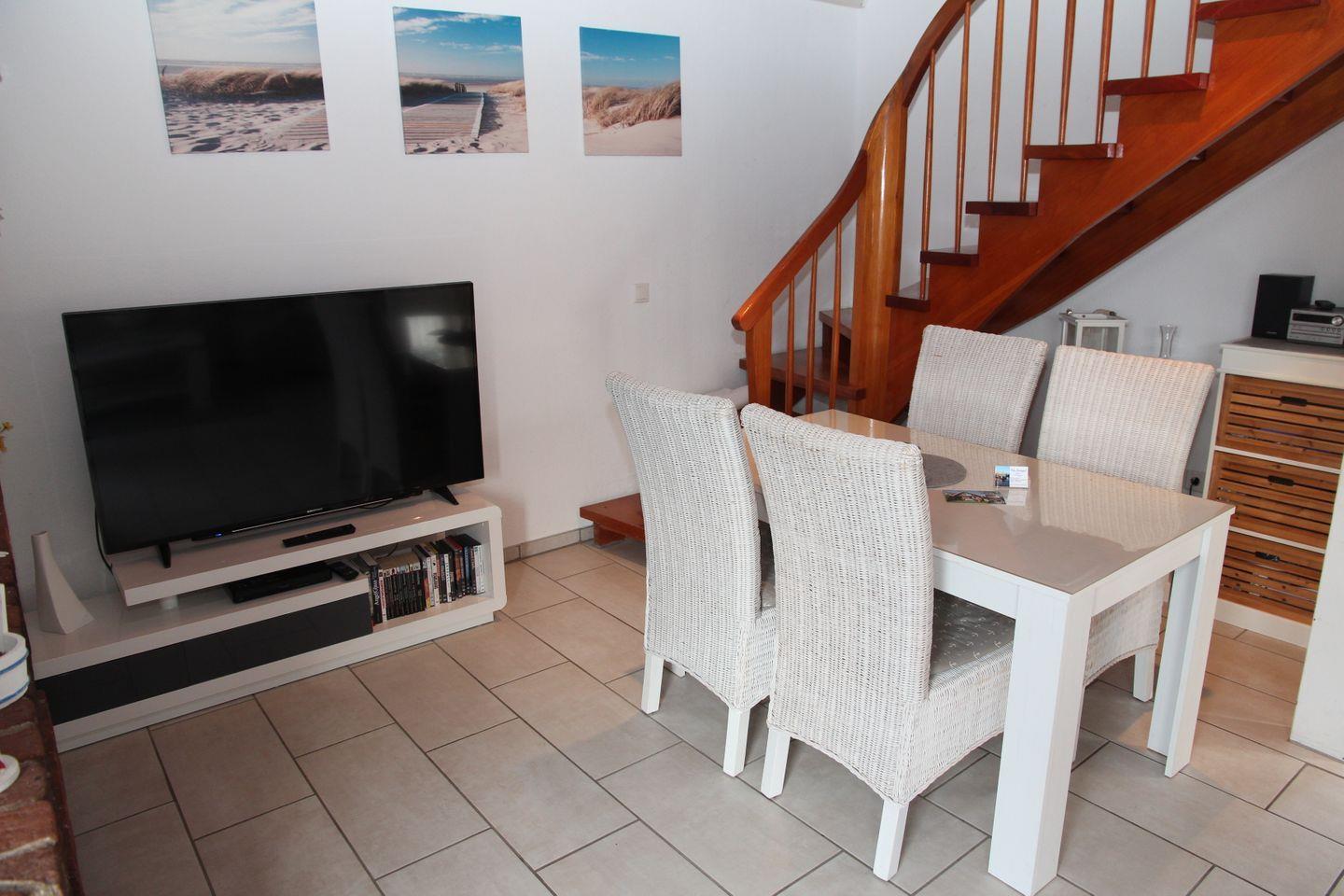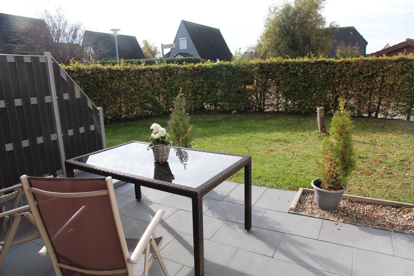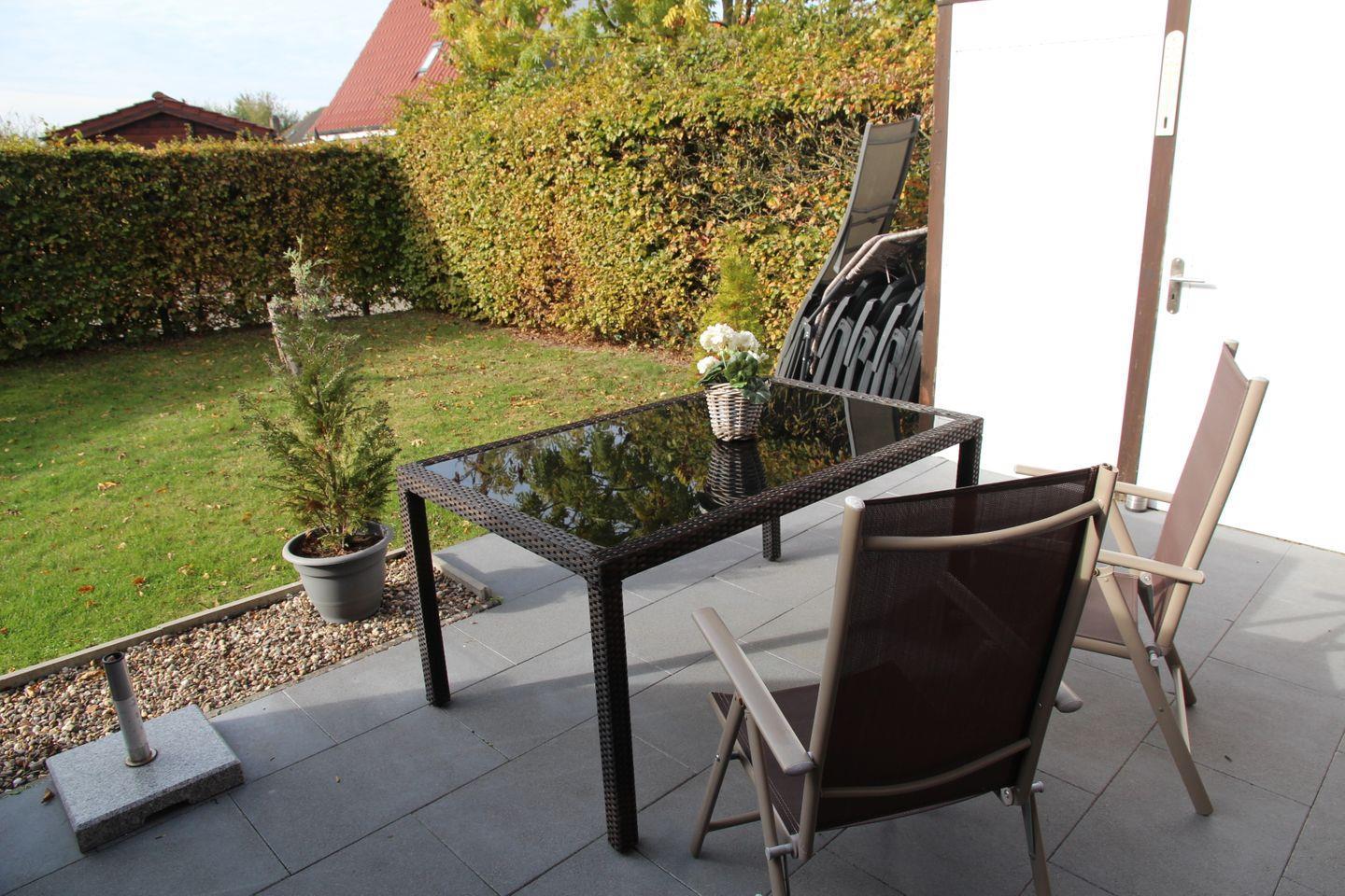 Im Erdgeschoss kommen Sie durch den Hausflur mit Garderobe in den Wohnbereich mit Küche, die über alle wichtigen Ausstattungsmerkmale wie bspw. Kühlschrank, Mikrowelle, Kaffeemaschine, kleinen Backofen, Cerankochfeld, Wasserkocher verfügt. Der Wohnbereich bietet ein gemütliches L-Sofa, einen großen Flachbildfernseher (55 Zoll), einen offenen Kamin und den Esstisch mit vier Stühlen (ein fünfter Stuhl ist im Gästezimmer vorhanden). Vom Wohnzimmer können Sie auch auf die möblierte Terrasse mit Tisch, Stühlen, Sonnenliegen und Sonnenschirm hinaustreten.