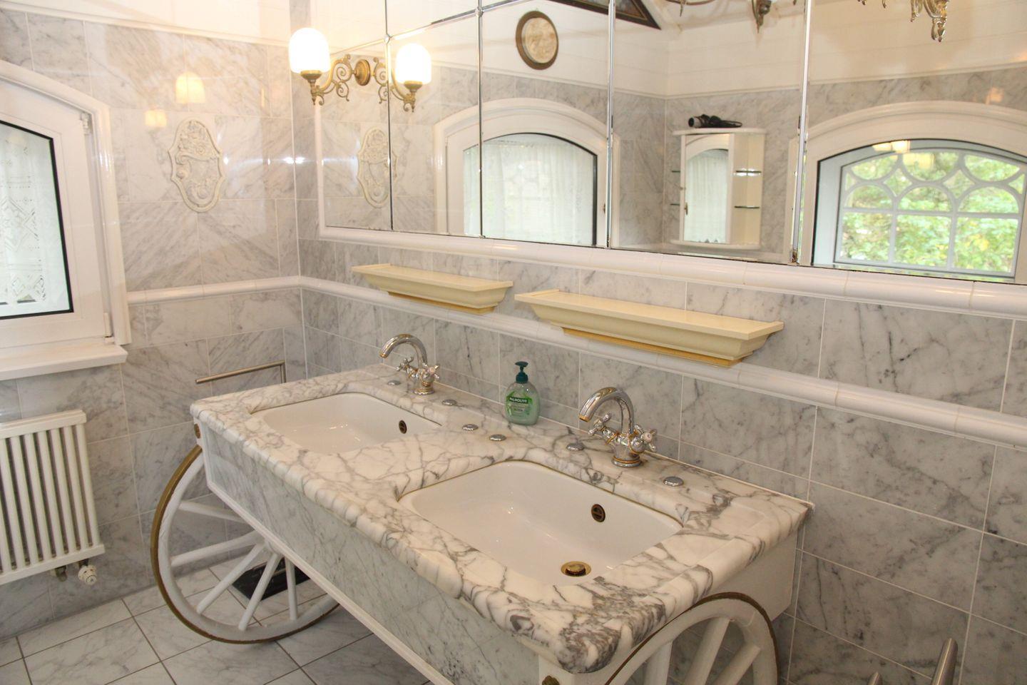 Im Obergeschoss landen Sie in einem schönen Flur mit hoher Decke, von dem alle weiteren Räume mit hochwertigen und historischen Türen abgehen. Dort befindet sich zum einen der zweite Wohnbereich mit zwei Sofas, einem Sessel, Couchtisch, großem Flachbildfernseher und einem Esstisch mit vier Stühlen. Dieser Raum ist durch zahlreiche Fenster und eine tolle Deckenhöhe angenehm hell. Im nächsten Raum befindet sich ein Schlafzimmer mit Doppelbett, großem Kleiderschrank und TV. Von hier aus geht auch das zweite Badezimmer in historischem und besonderem Stil ab: Doppelwaschbecken, riesiger Spiegel, stehende Badewanne und WC.