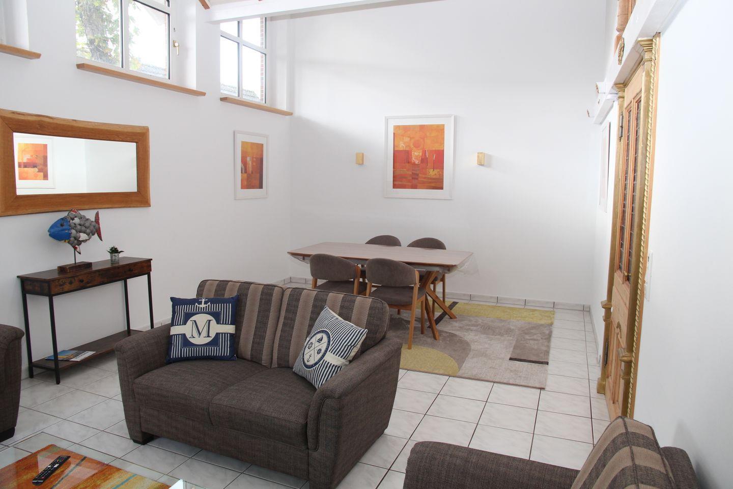 Betreten Sie das Haus durch die weiße Eingangstür in die große Garderobe im Eingangsbereich. Von dort aus gelangen Sie in den Wohnbereich im Erdgeschoss, wo Sie einen großen Flachbildfernseher, ein L-Sofa und einen Sitzplatz für 2 Personen vorfinden. Hier ist ebenfalls ein historischer Kaminofen vorhanden, der allerdings aus Brandschutzgründen nicht genutzt werden darf.