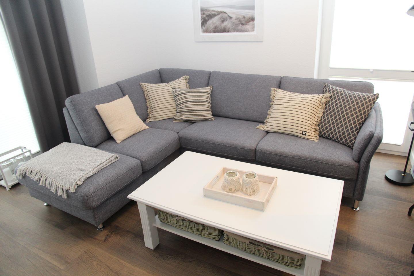Der Wohnbereich mit seinem bequemen Ecksofa und Sessel lädt zu gemütlichen Spieleabenden ein. Auch hier sorgt ein Smart-TV für beste Unterhaltung.