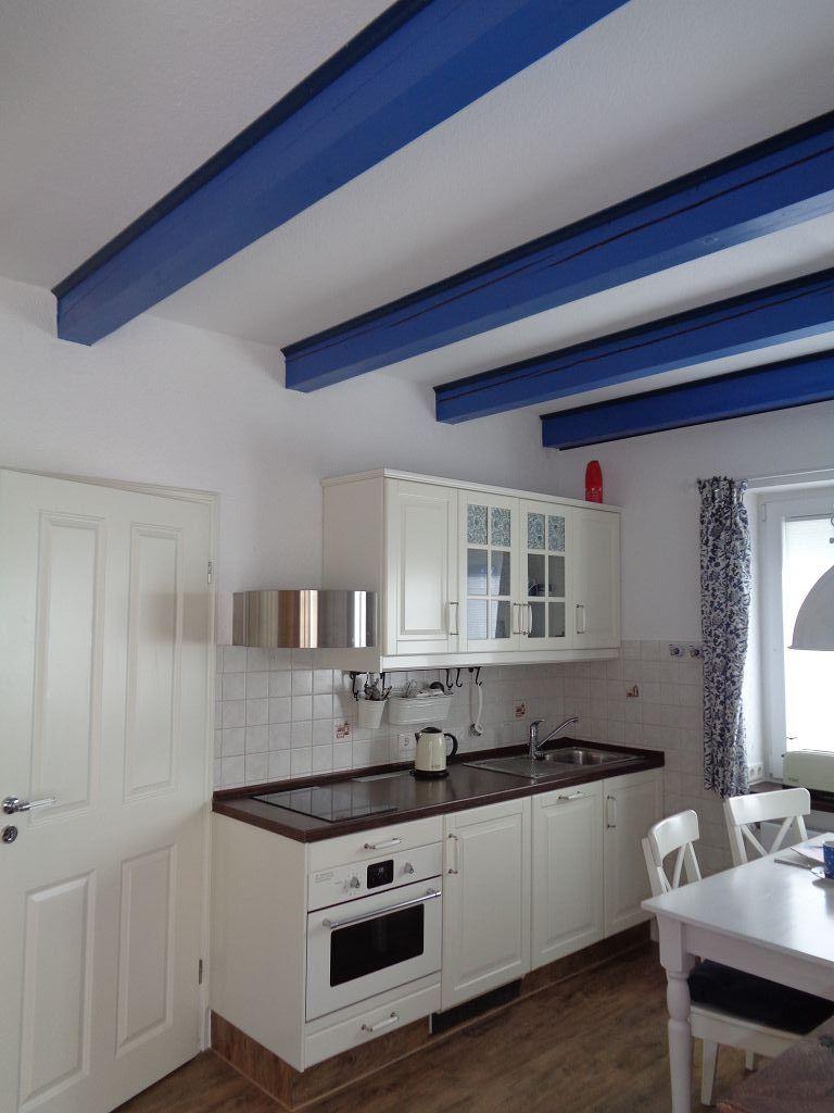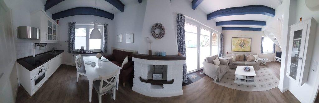 Die helle Küchenzeile lädt zum Kochen ein, während der Essbereich mit einem typisch ostfriesischem Sofa für gesellige Abende sorgt. Der eingebaute Kamin darf aus brandschutztechnischen Gründen nicht benutzt werden.