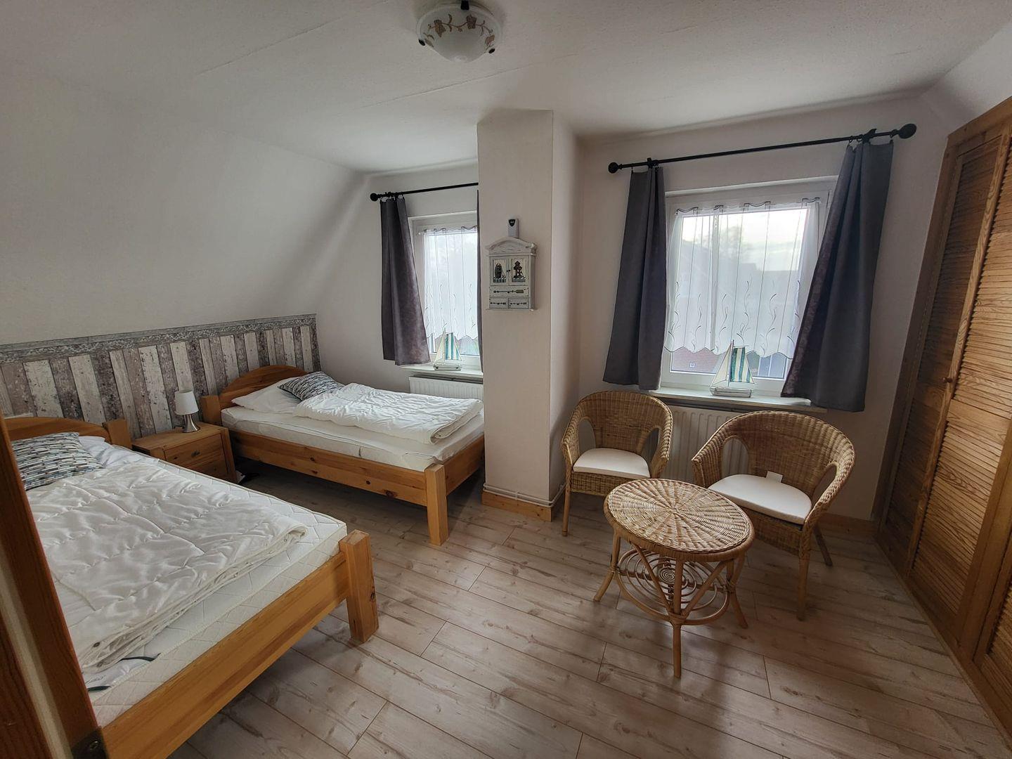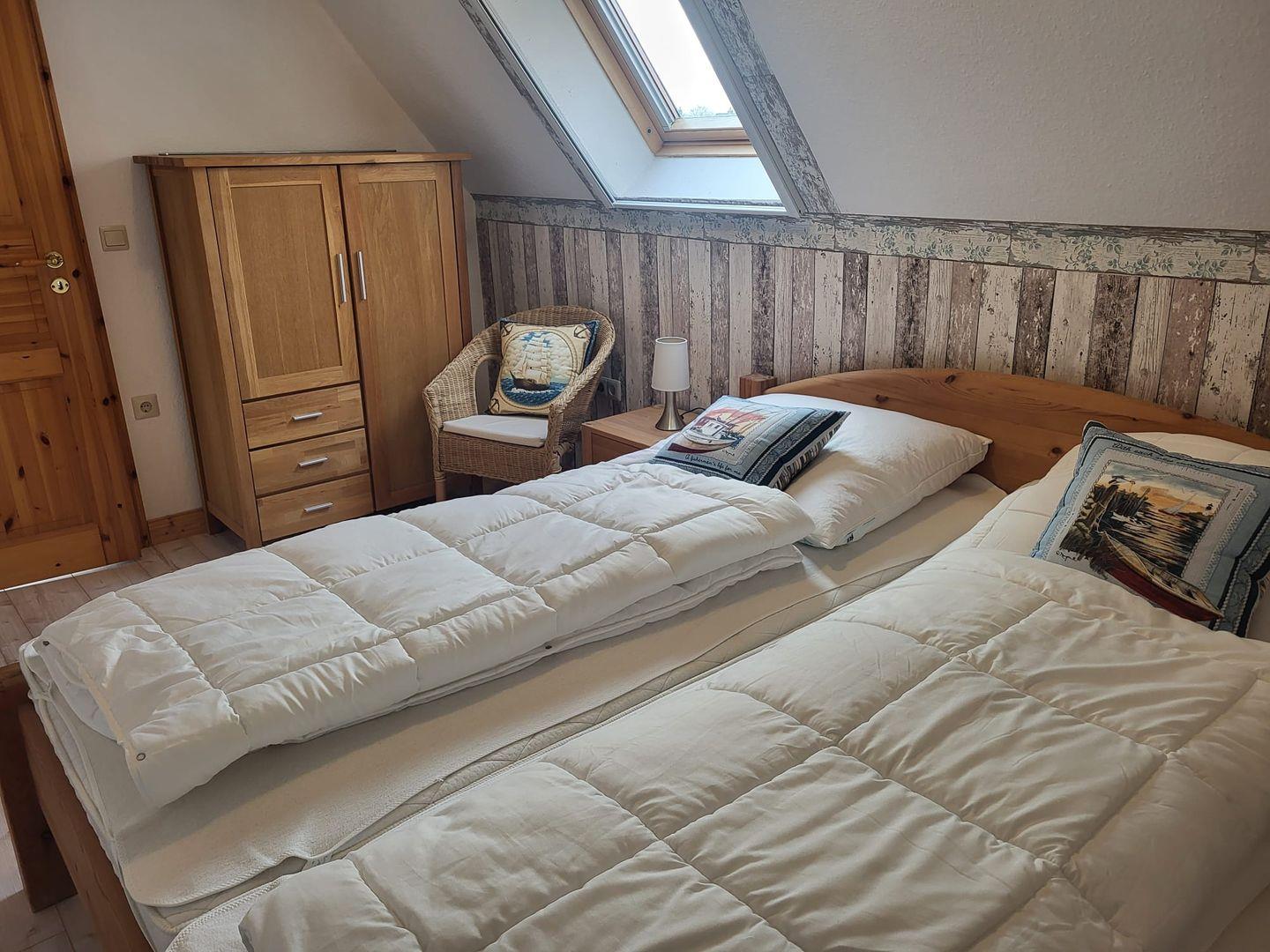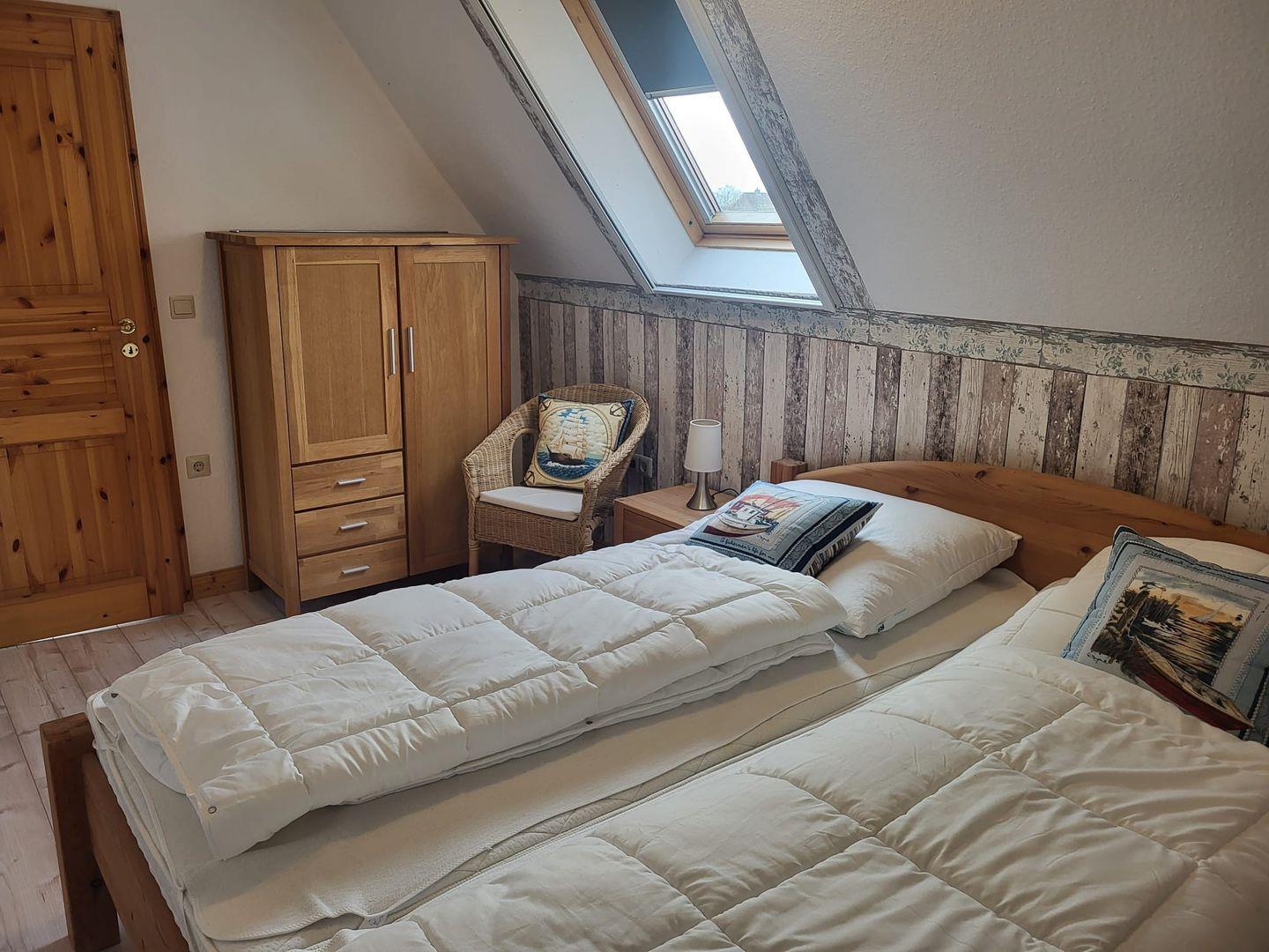 Über die Treppe erreichen Sie das Obergeschoss mit drei Schlafräumen: ein Zimmer mit einem Doppelbett und zwei weitere Zimmer mit je zwei Einzelbetten. Das gesamte Haus ist liebevoll und mit vielen Details eingerichtet. WLAN steht selbstverständlich zur Verfügung.