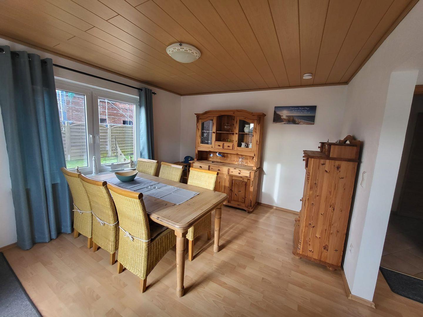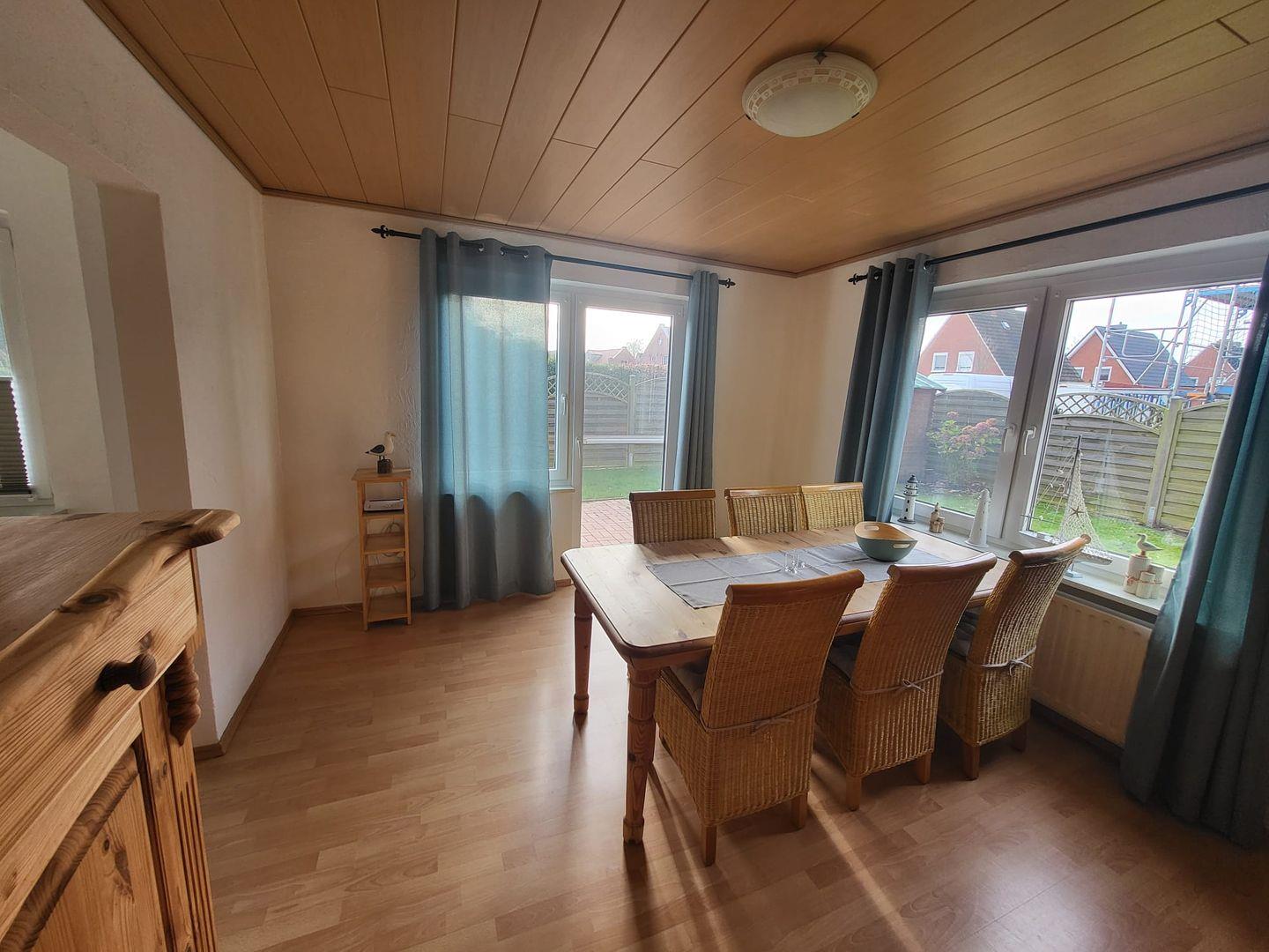 Ebenfalls vom Flur aus erreichen Sie die voll ausgestattete Küche – ein Ort, an dem sich jeder Hobbykoch wohlfühlt. Die zubereiteten Mahlzeiten können im angrenzenden Esszimmer am großen Tisch gemeinsam mit Familie oder Freunden genossen werden. Dieser gemütliche Raum eignet sich auch hervorragend für gesellige Klönabende. Von hier aus gelangen Sie auf eine zweite Terrasse sowie in den großen, eingezäunten Garten.