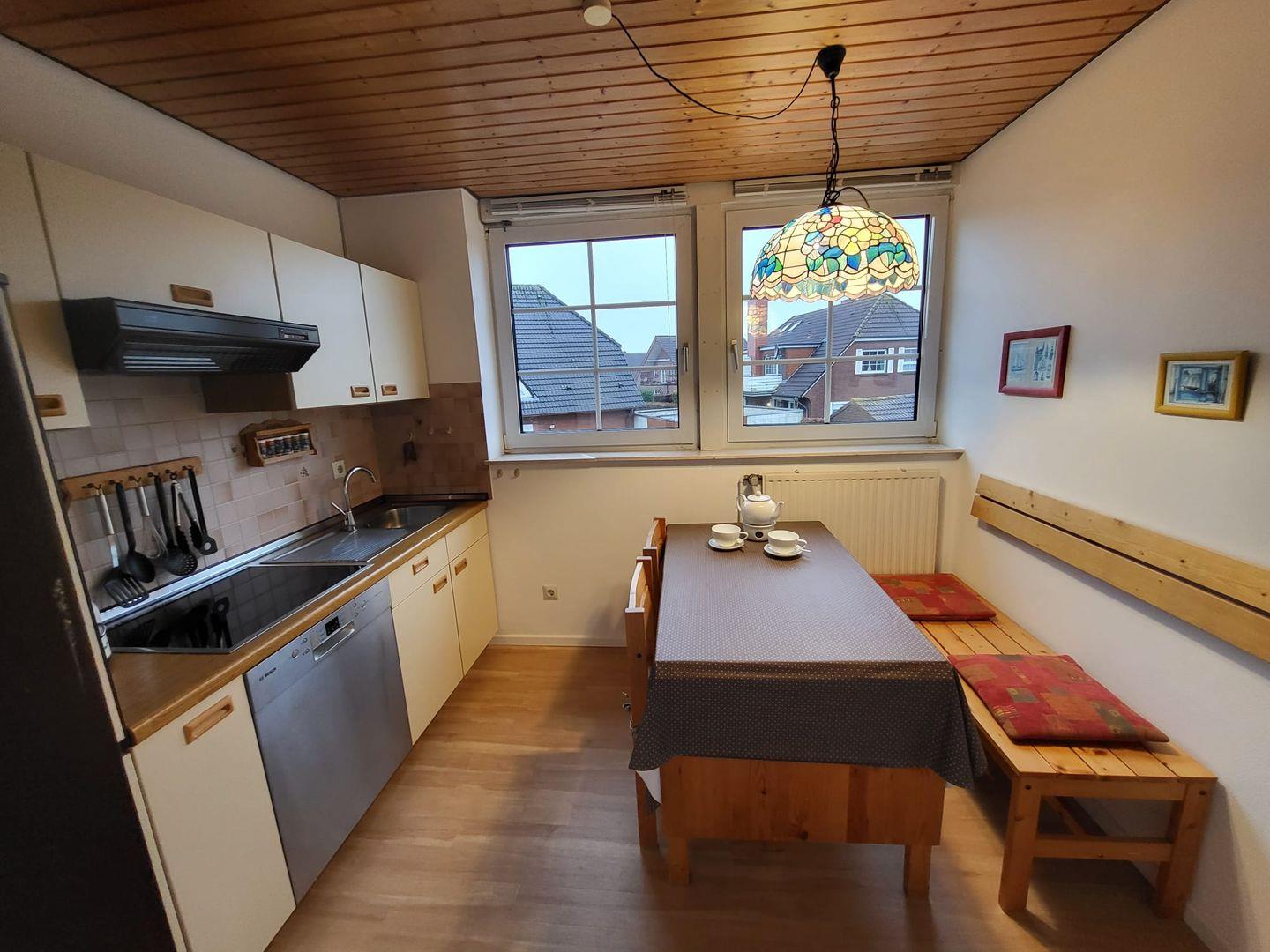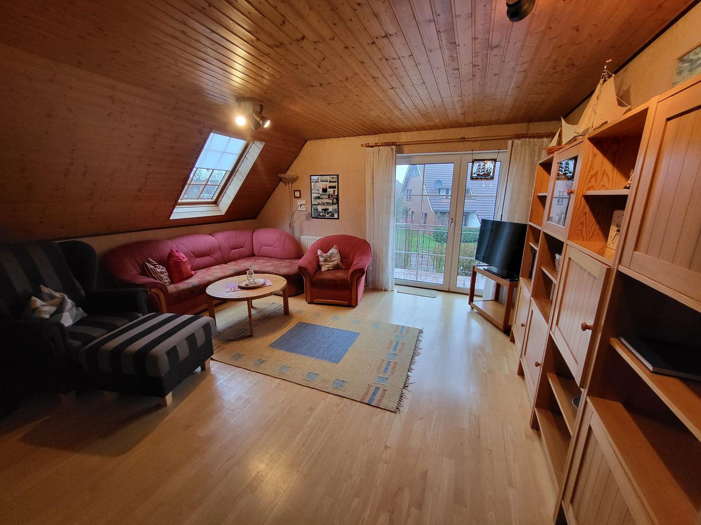 Die Ferienwohnung liegt im Obergeschoß eines Vier-Parteienhauses im ruhigen Ortsteil von Greetsiel nur wenige Gehminuten vom Zentrum entfernt. Der Wohnbereich verfügt u. a. über eine Couchgarnitur, einen Relaxsessel und Flachbild TV und lädt zu gemütlichen Abenden ein. Von hier gelangen Sie auf den Balkon, wo Sie die Ruhe genießen können. Neben dem Wohnzimmer befindet sich die helle Küche mit einem Esstisch und einer gemütlichen Bank. Die Küchenzeile bietet ein Cerankochfeld, Backofen, Geschirrspüler, Kaffeemaschine, Wasserkocher etc. Neben der Küche gibt es noch einen kleinen Abstellraum mit Waschmaschine, Staubsauger usw. Vom Flur aus geht es ins geräumige Badezimmer mit Dusche und WC. Ein Fön ist vorhanden! Nebenan befindet sich das Schlafzimmer mit Doppelbett und großem Kleiderschrank. Vom Wohnbereich führt eine Raumspartreppe in das Dachgeschoß, wo sich noch 2 Einzelbetten befinden. Die Betten sind durch eine Holzwand abgetrennt. Alle Fenster (bis auf das Dachgeschoß) sind mit Außenrollos ausgestattet. Ein Parkplatz befindet sich vor dem Haus.