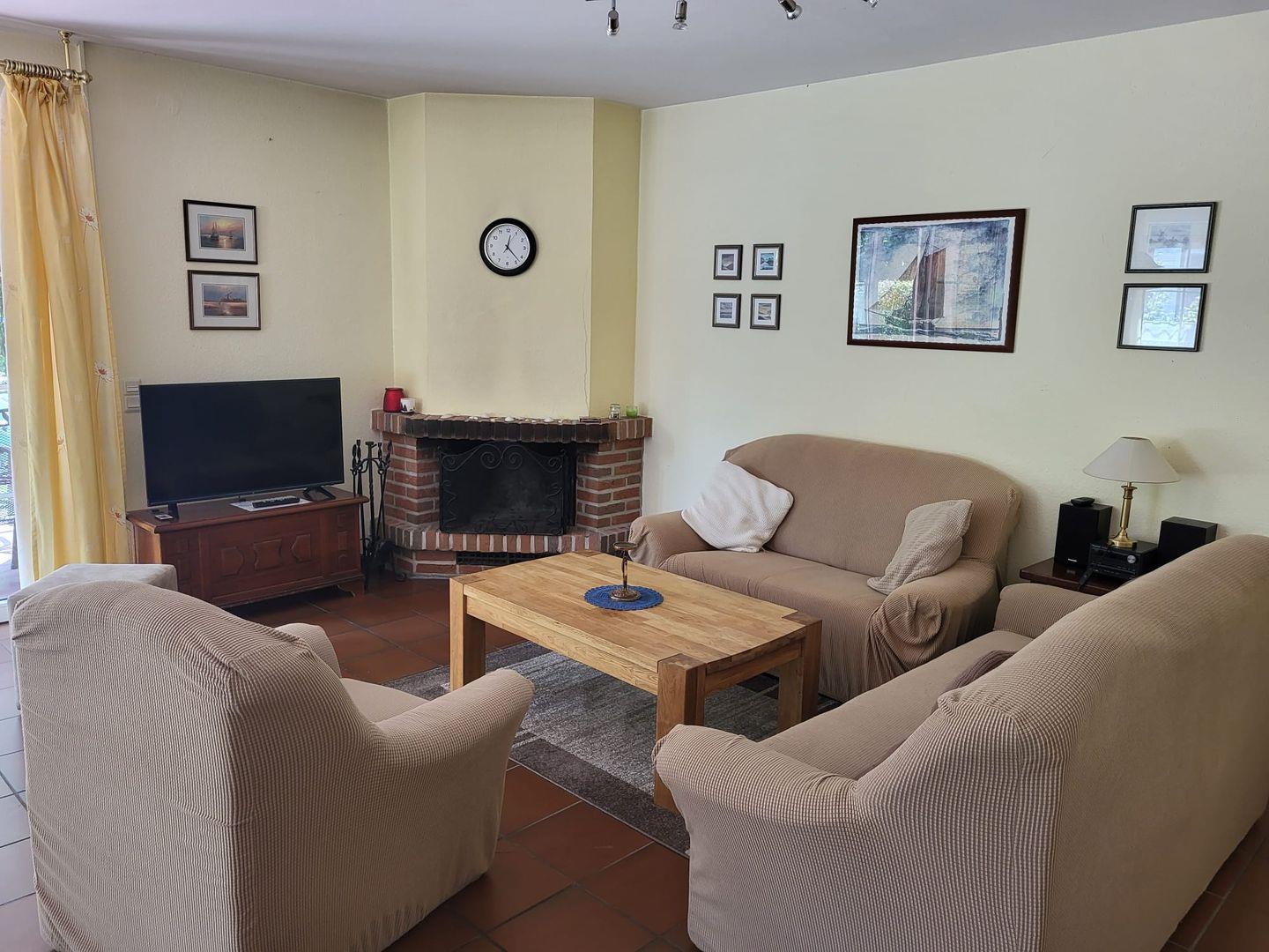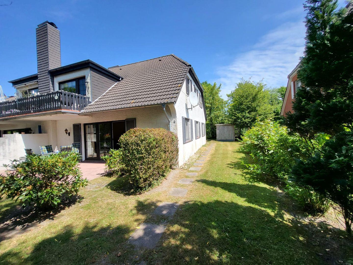 Kommen Sie herein! Von einem kleinen Flur gelangen Sie in den Wohnbereich. Genießen Sie auf der gemütlichen Couch vor dem Kamin kuschelige Abende. Die große Terrassentür bietet viel Tageslicht. Von hier haben Sie direkten Zugang zur Südterrasse. Genießen Sie die Ruhe und die frische Nordseeluft. Der Garten mit altem Baumbestand rundet die Entspannung ab.
