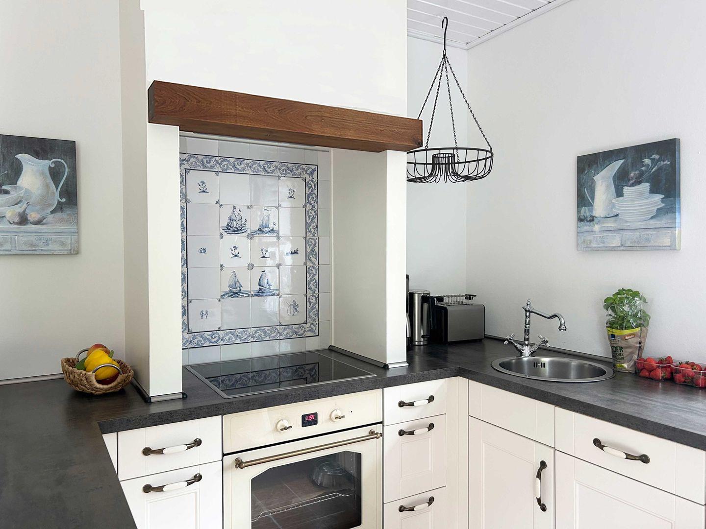 Im geräumigen Wohn- und Essbereich treffen ostfriesische Gemütlichkeit und liebevolle Details aufeinander. Historischer Charme durchzieht das Apartment, von den Delfter Fliesen bis hin zum alten Eichendielenboden, und wird durch ausgewählte Weichholz-Antiquitäten ergänzt. Hochwertige Boxspringbetten versprechen einen erholsamen Schlaf und höchsten Komfort.