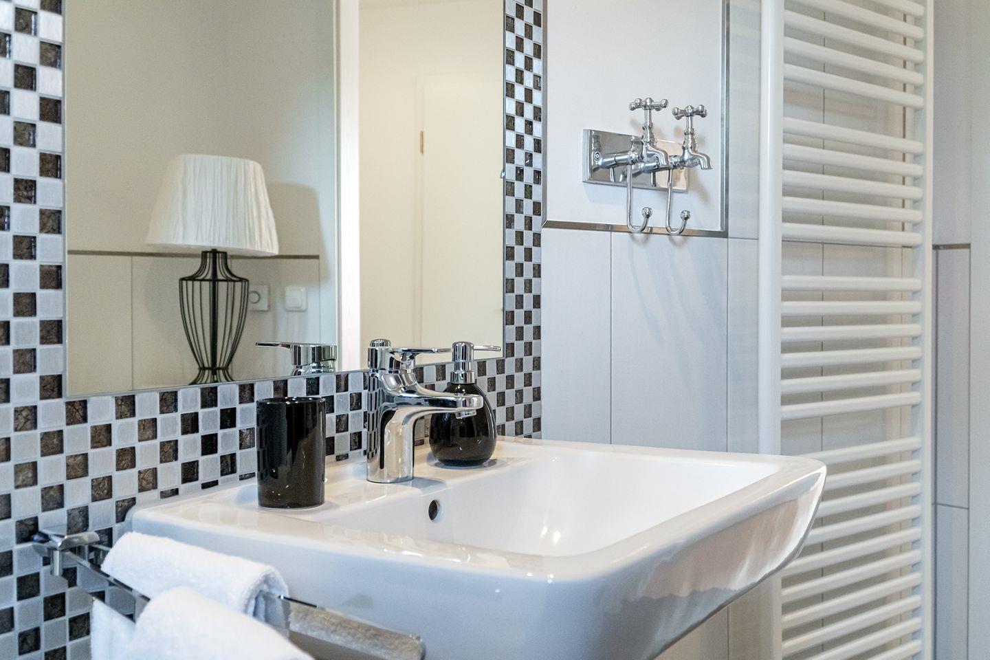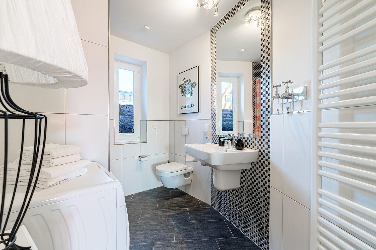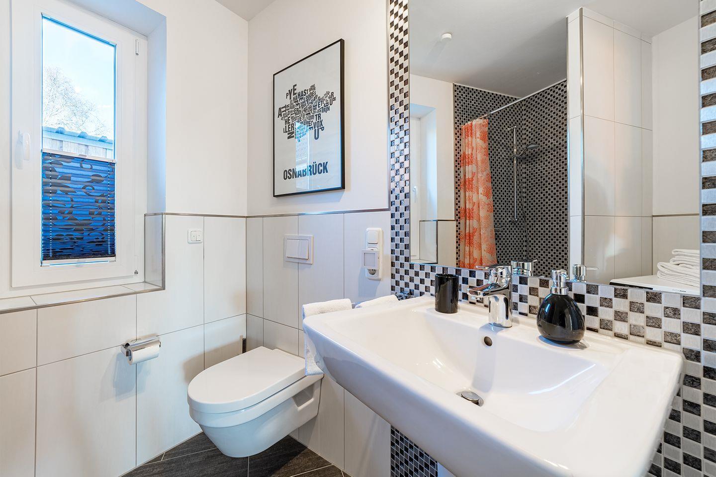 Badezimmer: Mit einer bodengleichen Dusche und WC.