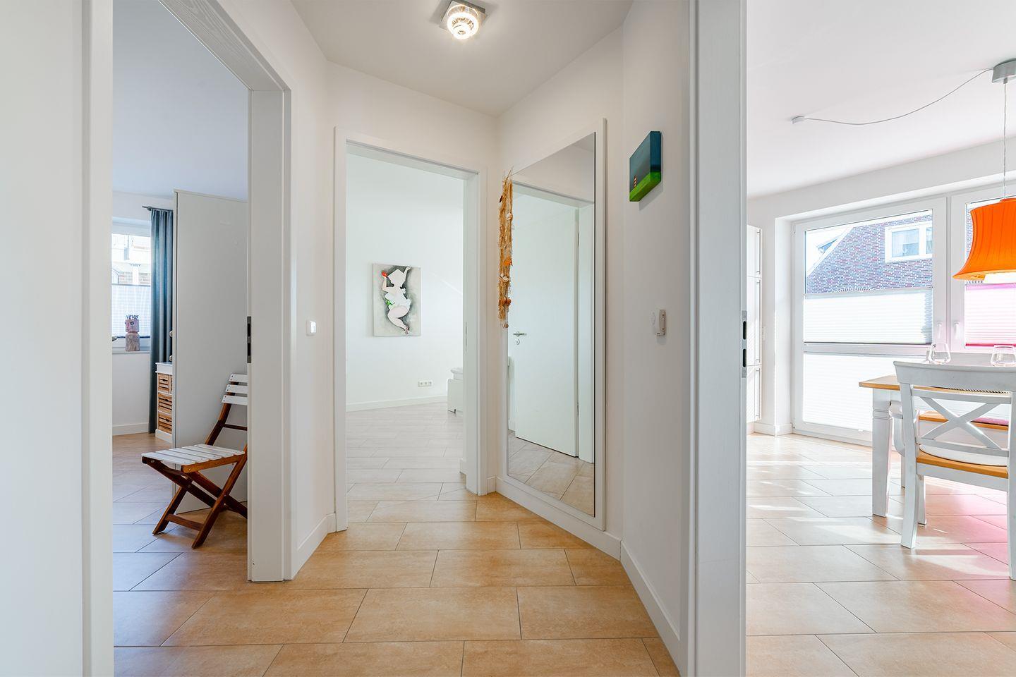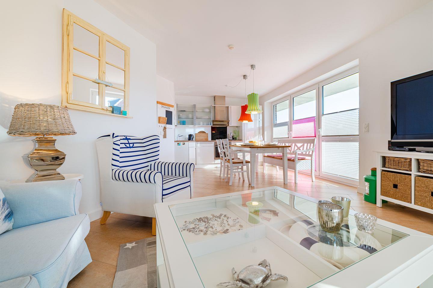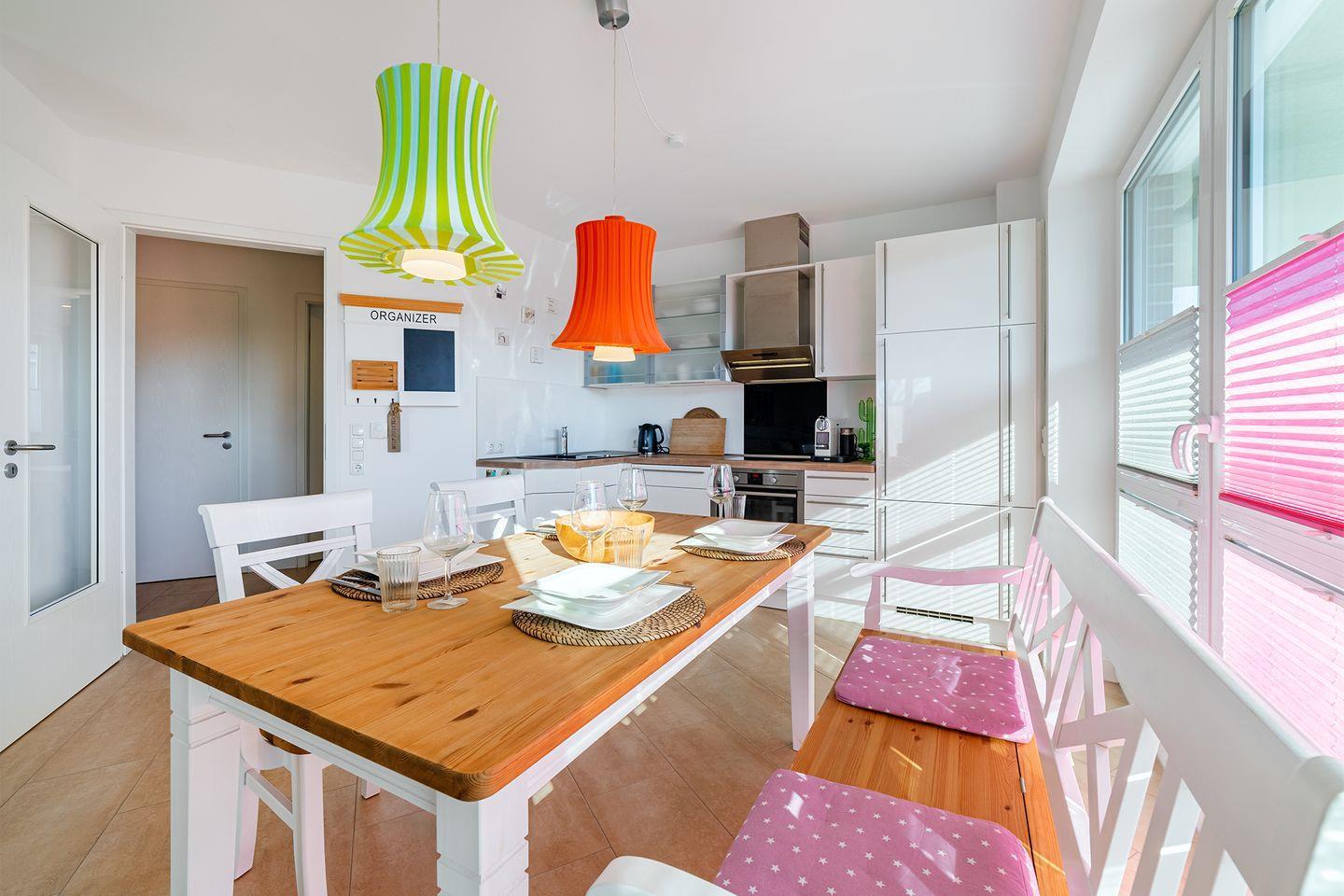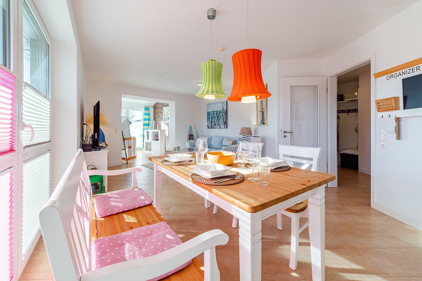 Die Ferienwohnung Elas Nüst bietet auf 90 qm alles, was Sie für einen tollen Urlaub brauchen. Mit einem großen Wohnraum inklusive Einbauküche, Esstisch und gemütlicher Sofaecke, sowie zwei Schlafzimmern mit komfortablen Doppelbetten und TV. Das schöne Bad verfügt über eine bodengleiche Dusche und WC. Zwei Terrassen, ein Parkplatz direkt vor dem Haus und ein Abstellraum für Fahrräder runden das Angebot ab. Genießen Sie entspannte Urlaubstage in dieser hellen und gemütlichen Ferienwohnung.