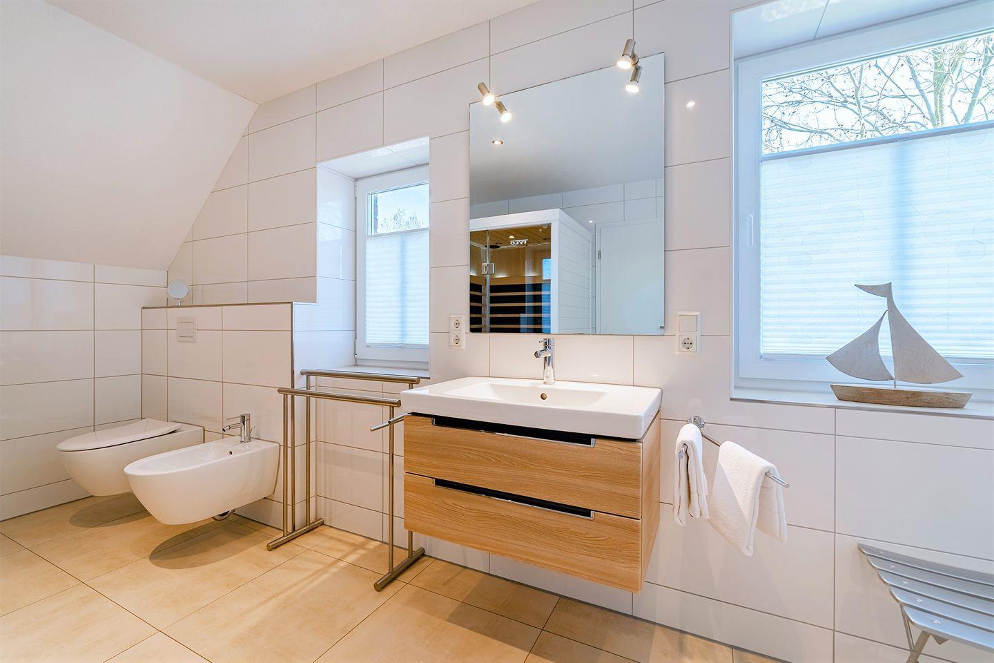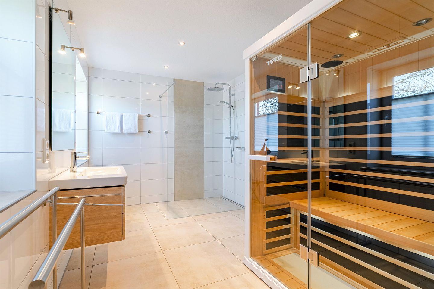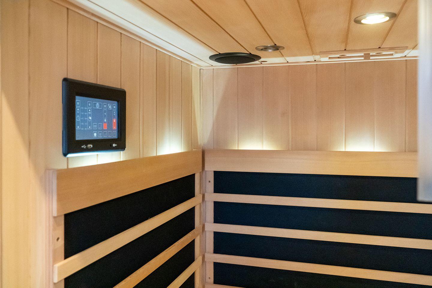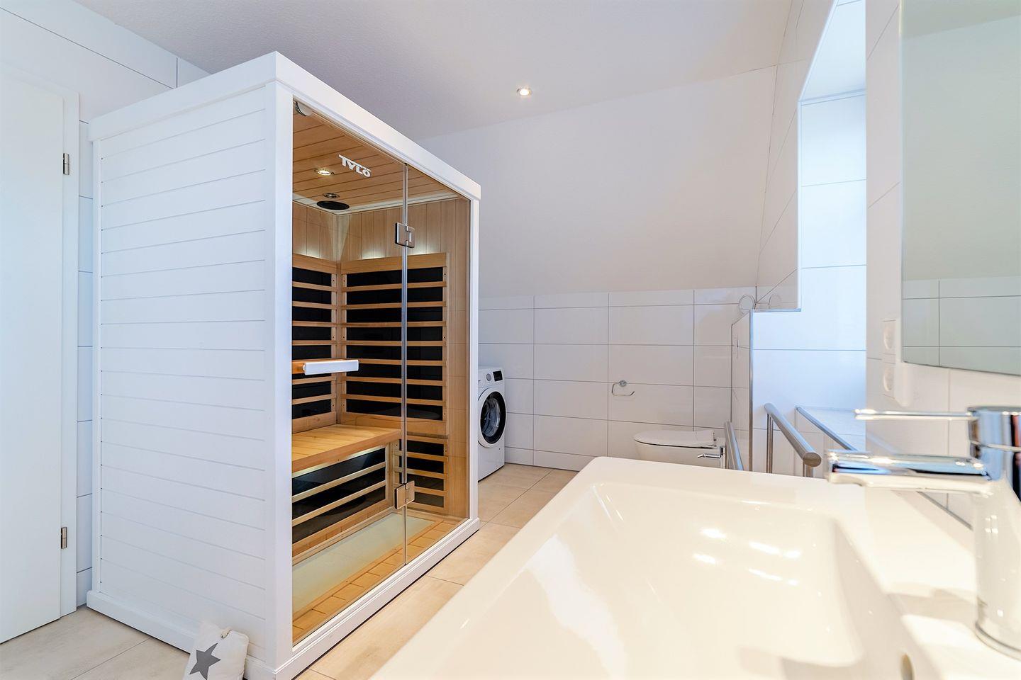 Ein großes Badezimmer mit Infrarotwärmekabine (TYLÖ Prime+ / Farbtherapie und Soundsystem)