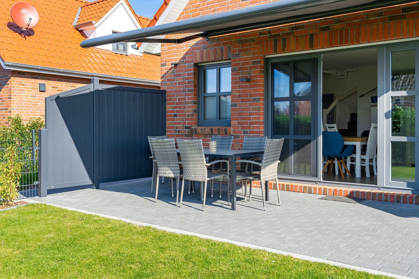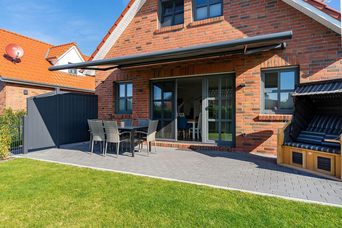 Ein schöner Gartenbereich mit einer Terrasse (südwestlich), die über eine elektrische Markise verfügt