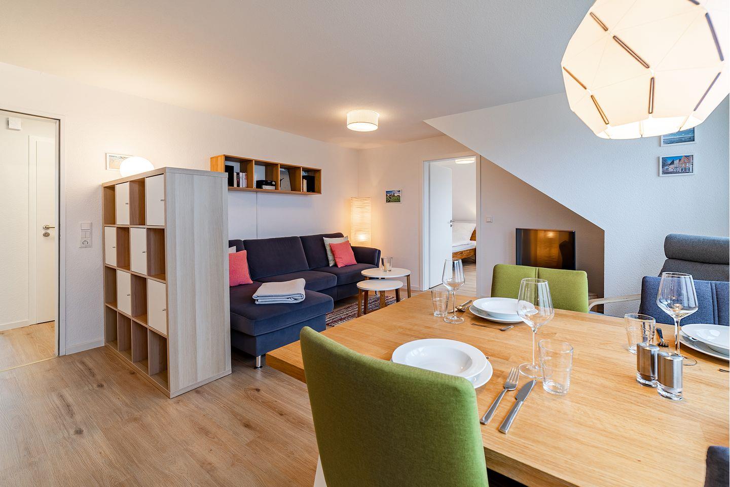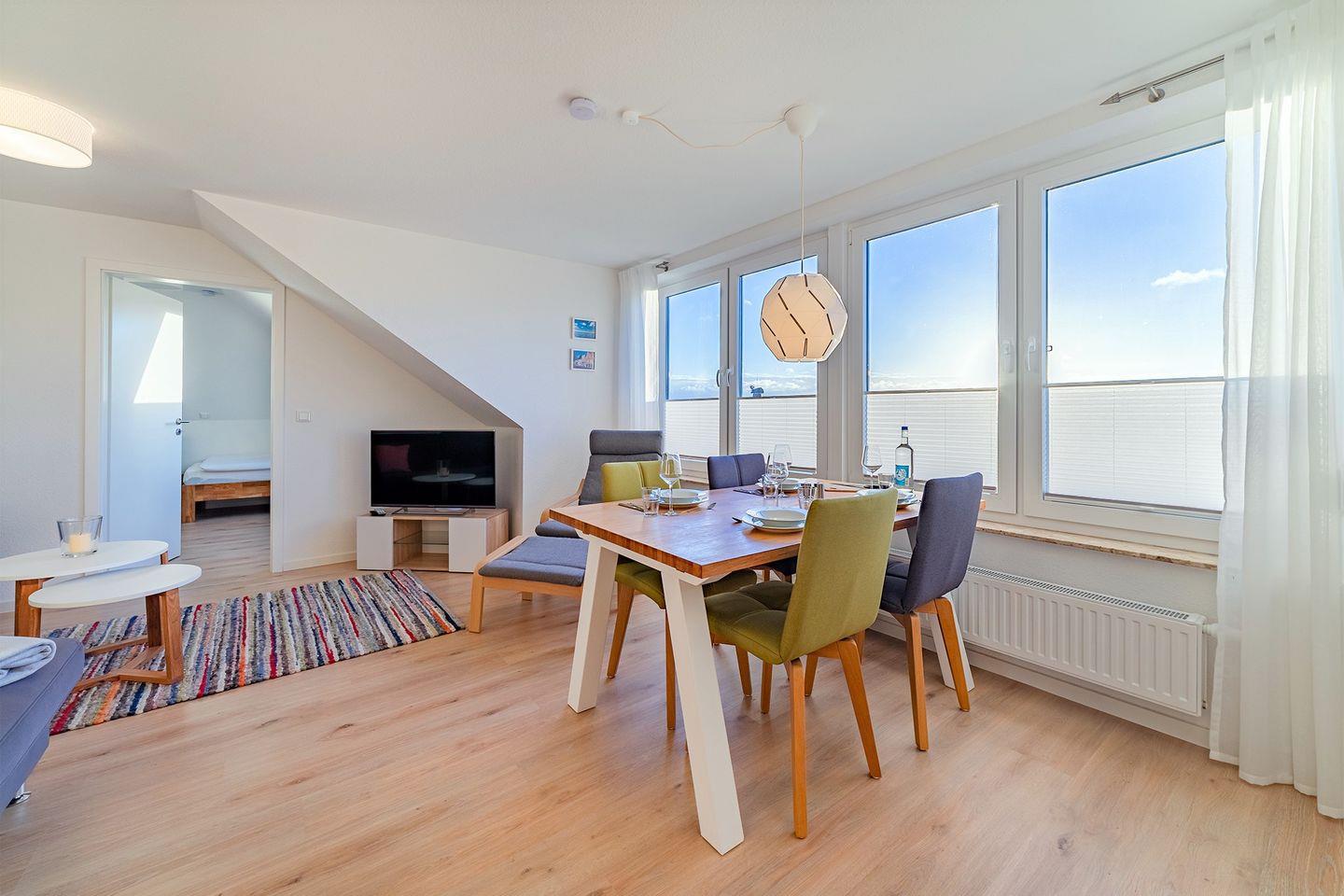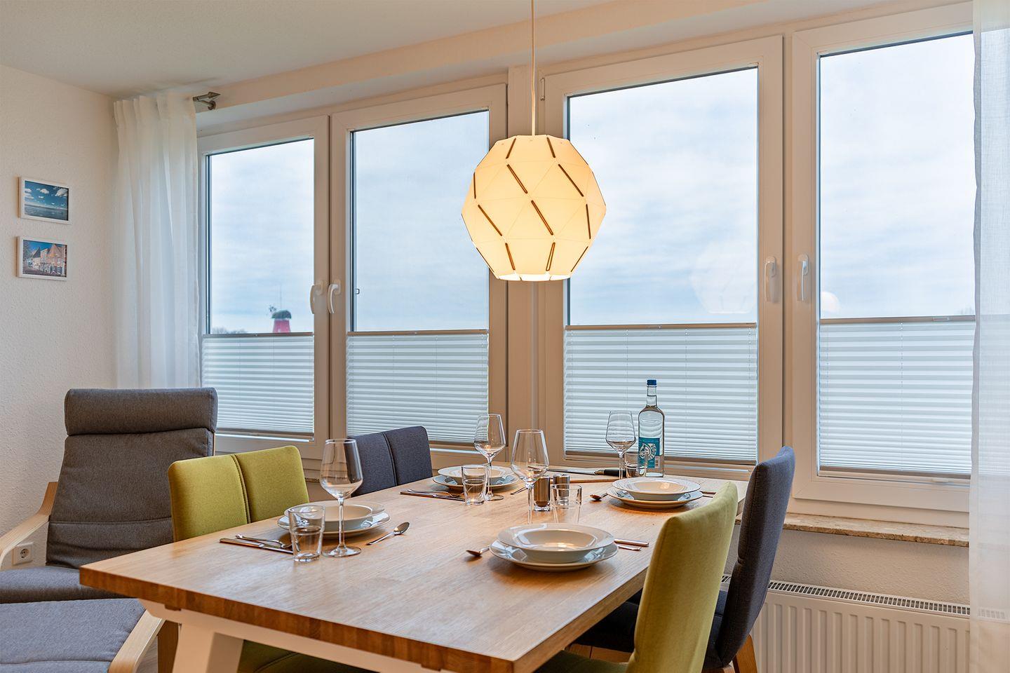 Der geräumige Wohn-Ess-Bereich ist der ideale Ort, um gemeinsam Zeit zu verbringen. Schon beim Frühstück genießen Sie den freien Blick auf die Greetsieler Zwillingsmühlen, der den Morgen perfekt macht.