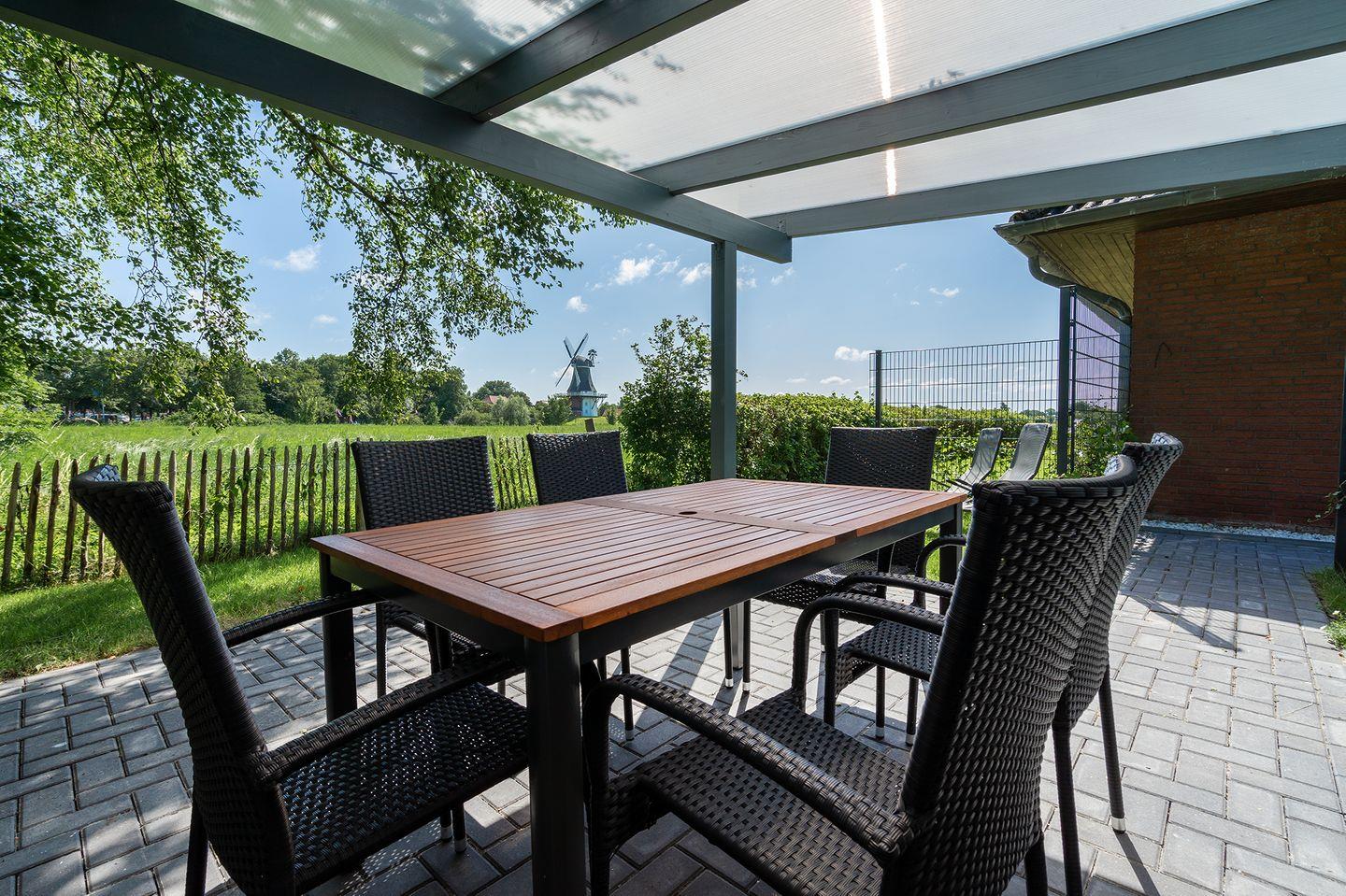 Die sonnige Terrasse direkt am Greetsieler Tief ist der perfekte Ort, um bei einer Tasse Tee zu entspannen und das Treiben auf dem Wasser zu beobachten. Von hier aus haben Sie einen schönen Blick auf den Touristenbereich, jedoch in ruhigerer Lage, um den Trubel zu entfliehen.