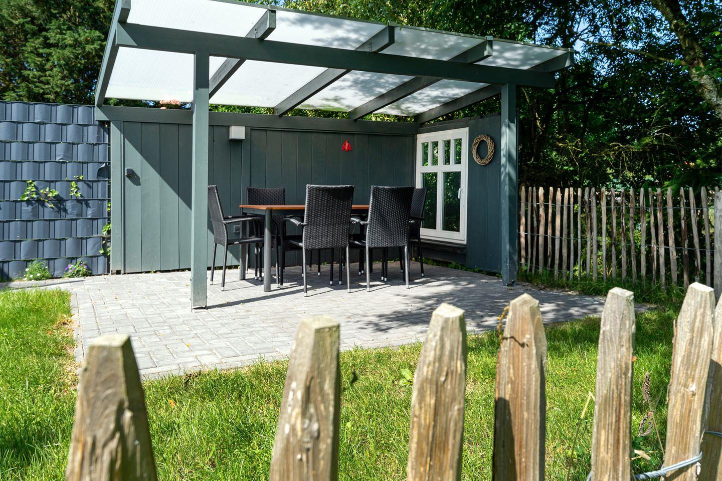 Ein Parkplatz befindet sich direkt vor dem Haus, ebenso wie ein Abstellraum für Fahrräder.