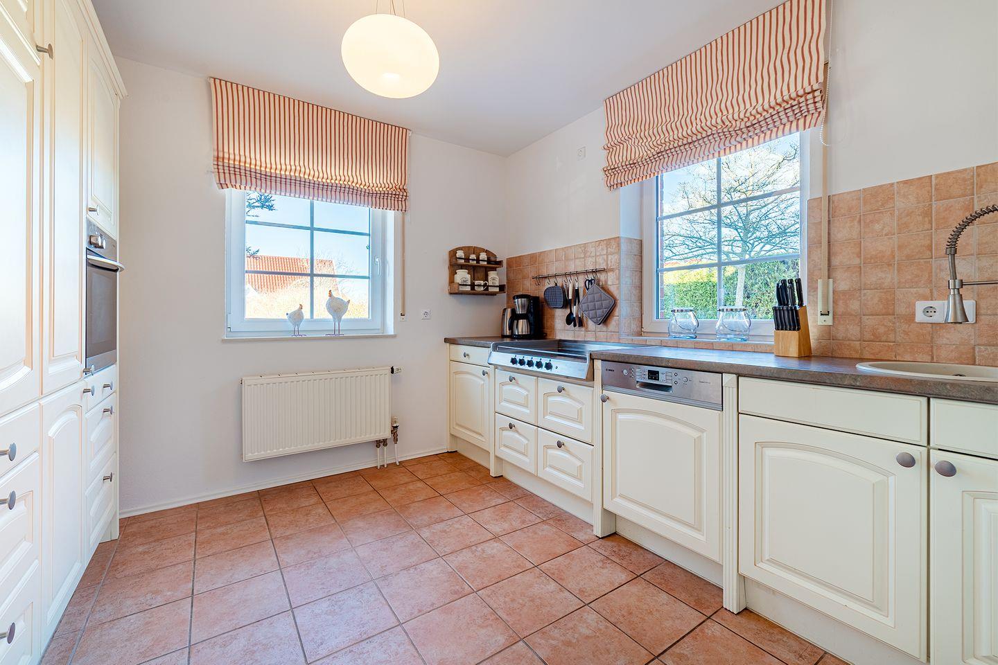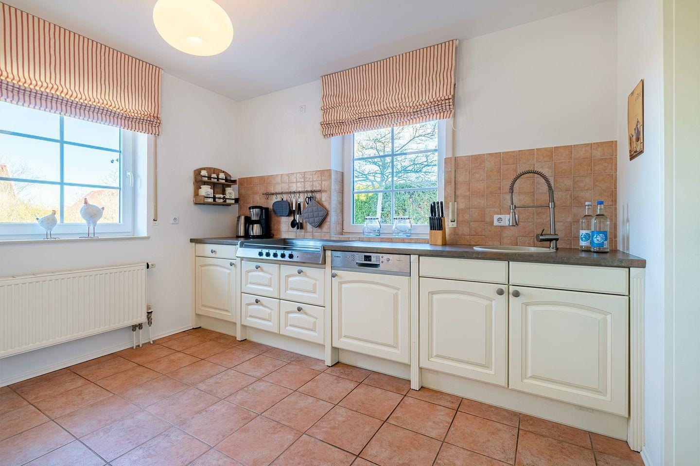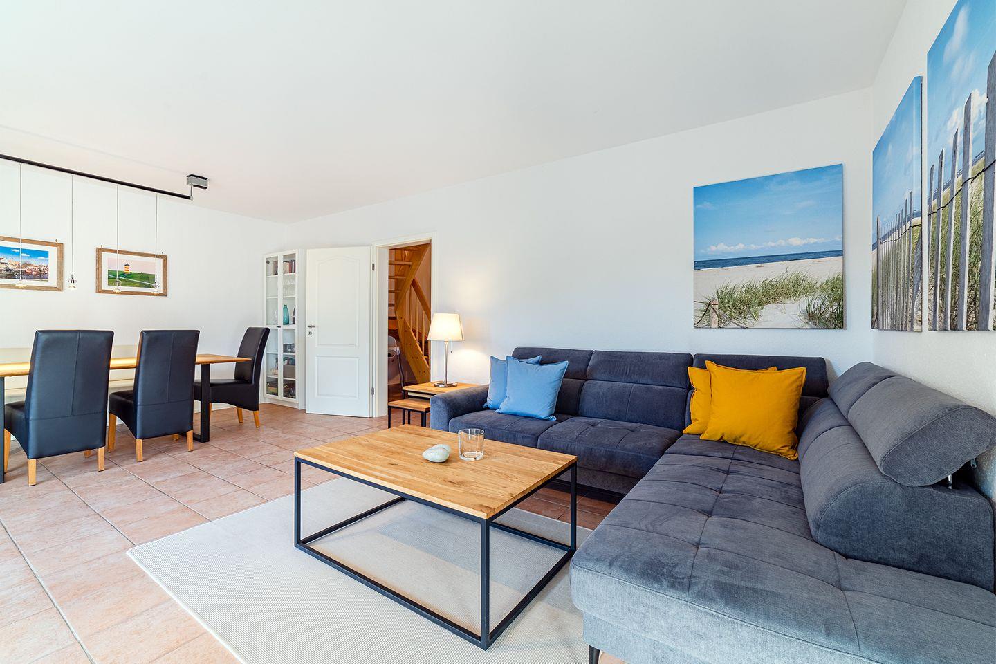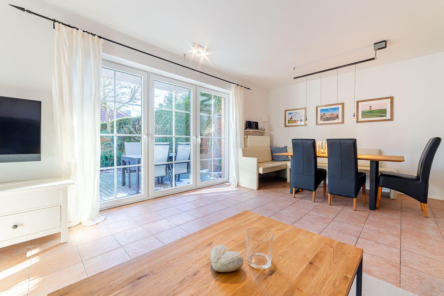 Die gesamte Doppelhaushälfte "Jolle" ist gemütlich und neuwertig eingerichtet. Hier werden Sie sich so richtig wohlfühlen! Der Wohnraum mit großem Essbereich ist durch eine große Fensterfront sehr hell und bildet den Mittelpunkt des Hauses. Außerdem erwartet Sie eine voll ausgestattete Küche. Das Haus verfügt über zwei Fernseher. In der oberen Etage befinden sich die drei Schlafräume mit je einem 180x200 cm großen Bett und das Bad. Bei schönem Wetter genießen Sie die geschützte und nicht einsehbare Terrasse.