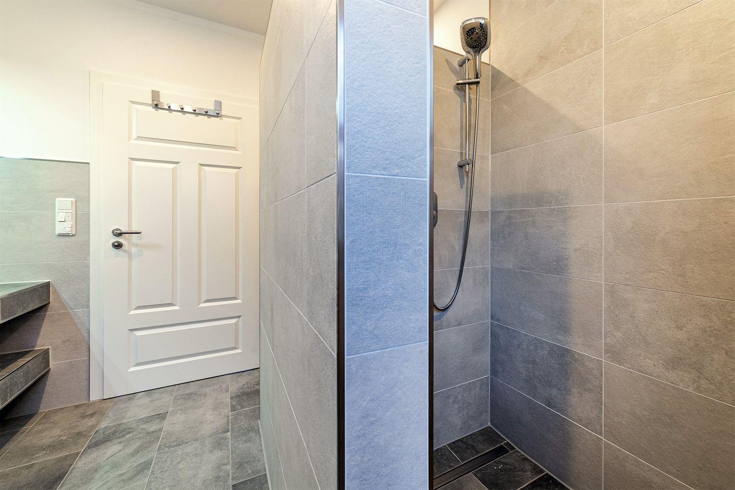 Das Badezimmer ist mit einer ebenerdigen Dusche und WC ausgestattet und bietet Ihnen modernen Komfort.