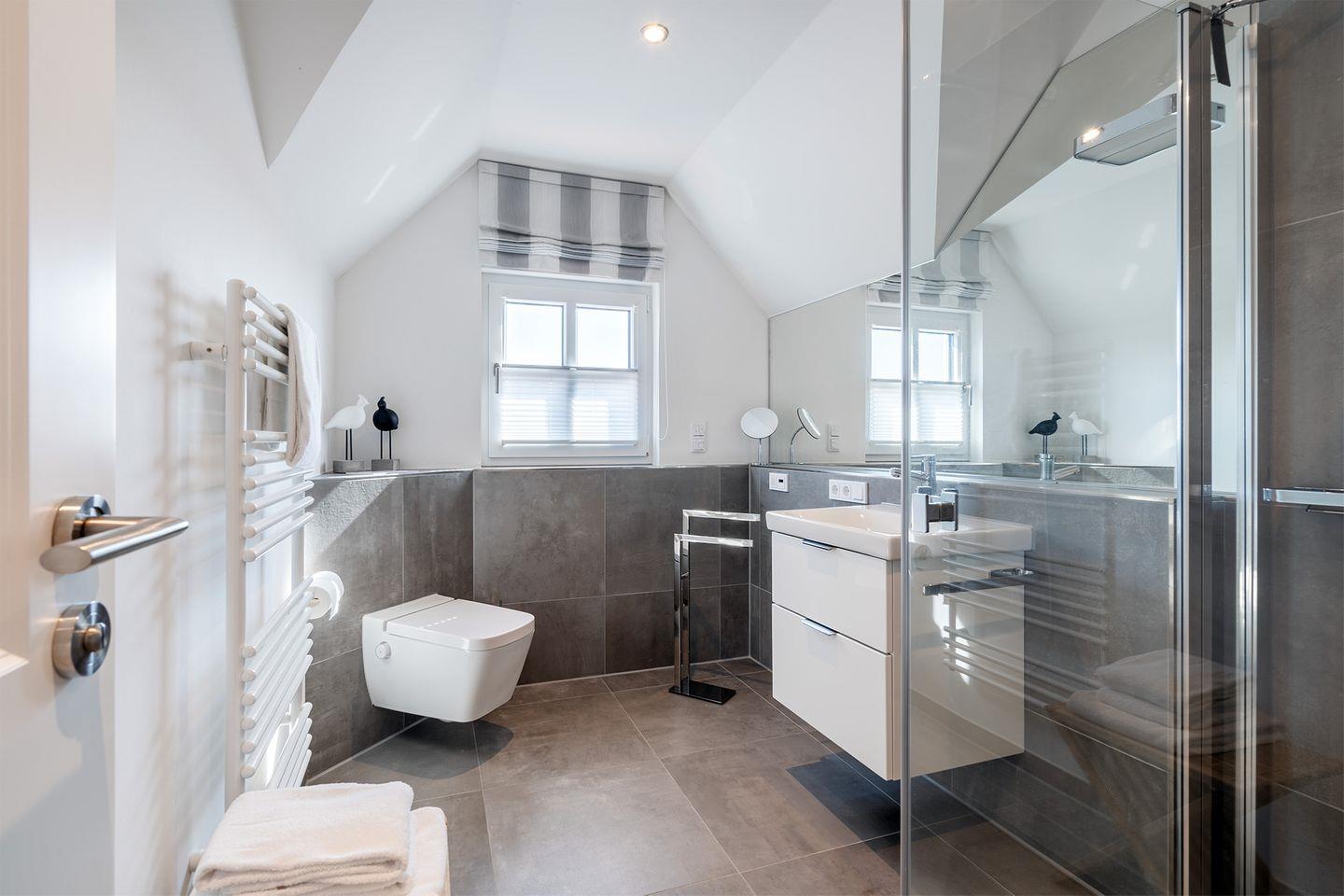 Beide Bäder sind mit Fußbodenheizung, Handtuchheizkörper, Großflächenspiegel, Kosmetikspiegel, Regendusche und TECE One Dusch WC ausgestattet.