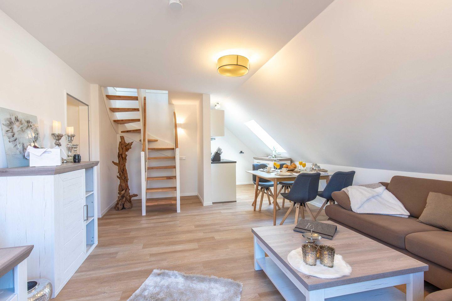 Im Wohnbereich steht Ihnen ein Essplatz für vier Personen, sowie eine gemütliche Sofaecke zur Verfügung. Ausgestattet mit einer Küche, Smart TV, WLAN und einem neuen Badezimmer. Durch die zentrale Lage ist der Ortskern mit vielen Restaurants und Einkaufsmo¨glichkeiten in wenigen Gehminuten zu erreichen.