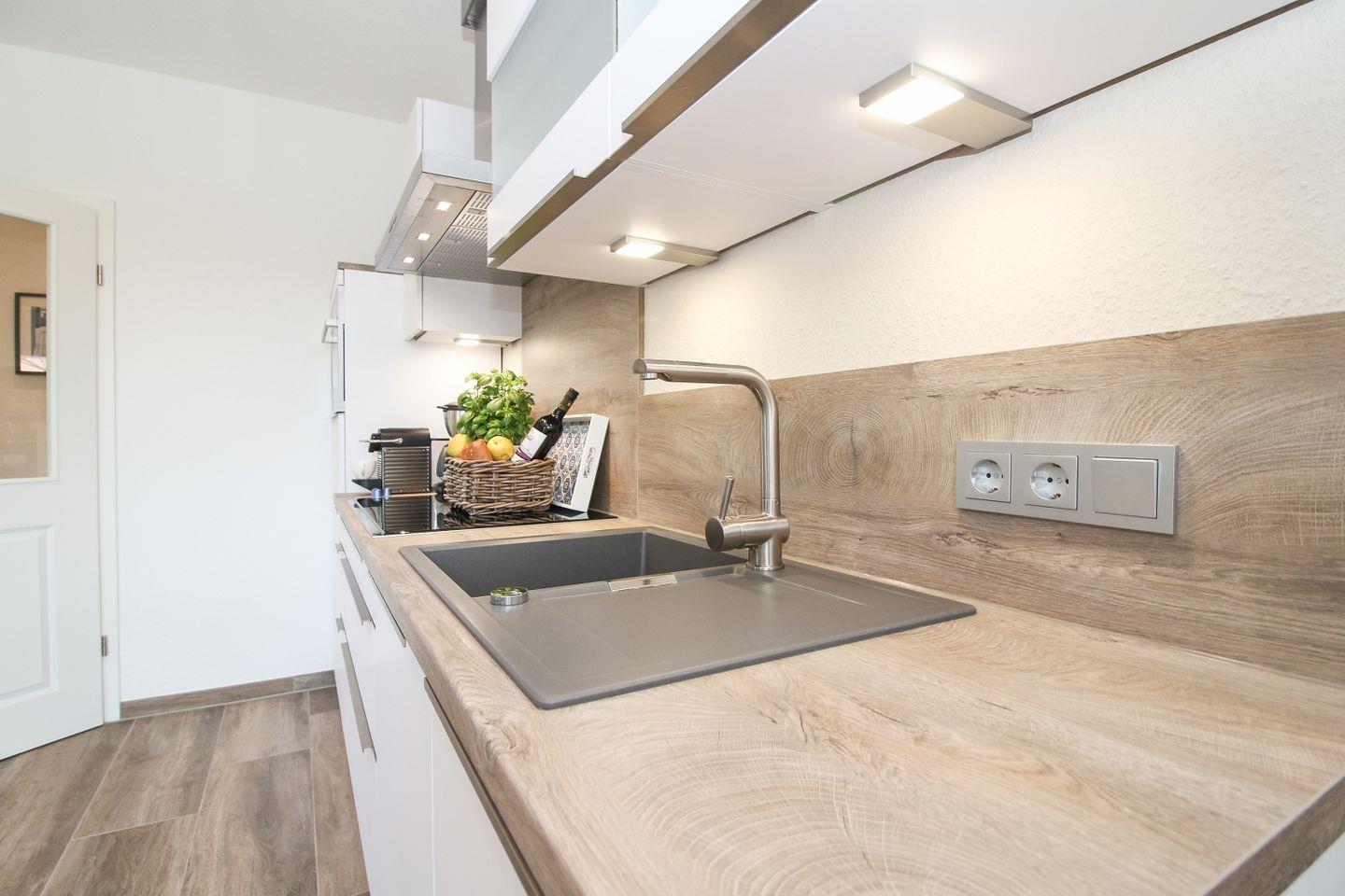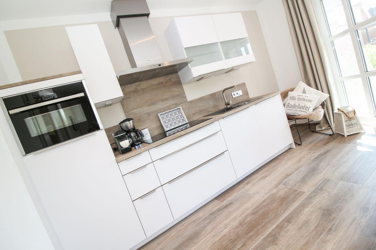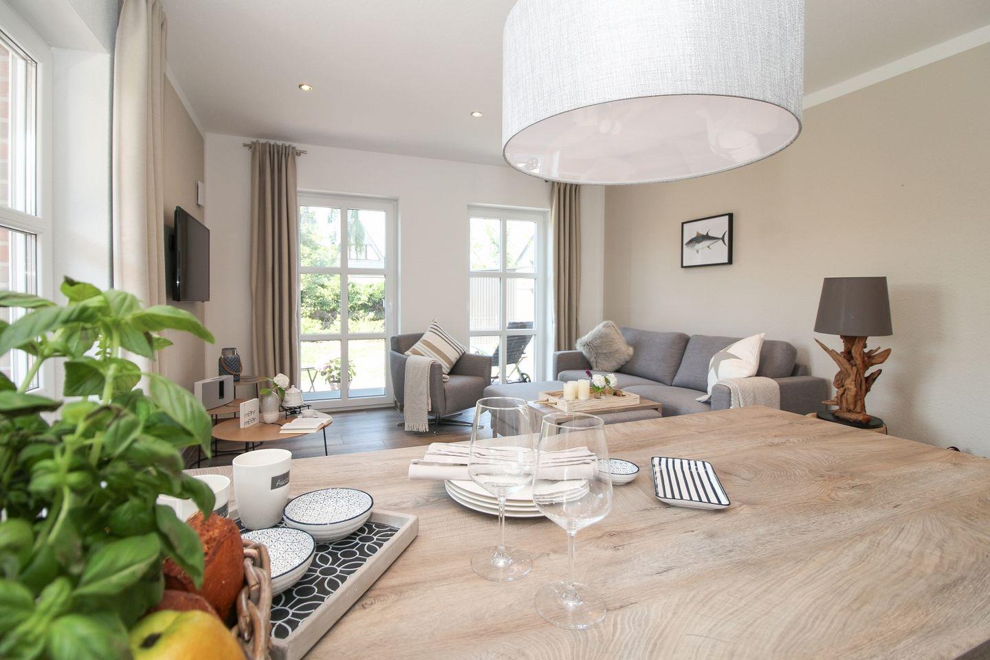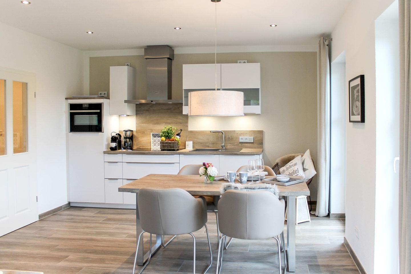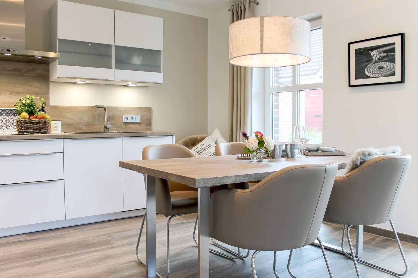 Der Wohn- und Essbereich ist modern und gemütlich eingerichtet. Die offene Küchenzeile ist vollständig ausgestattet, damit Sie Ihre Mahlzeiten bequem zubereiten können. Der Bereich bietet ausreichend Platz, um gemeinsam Zeit zu verbringen und den Urlaub zu genießen.