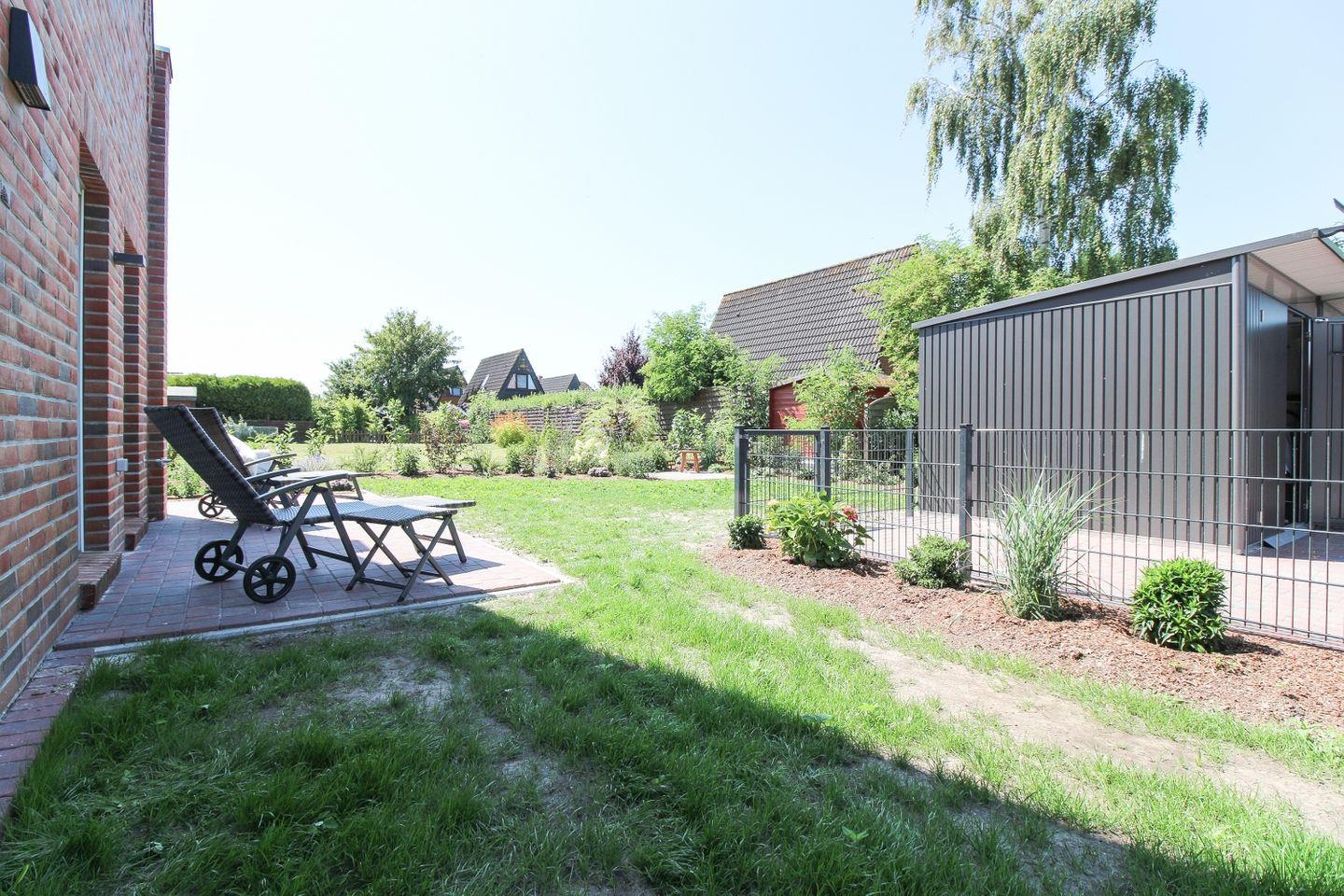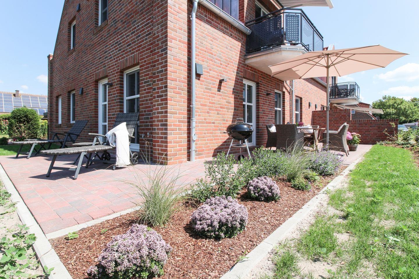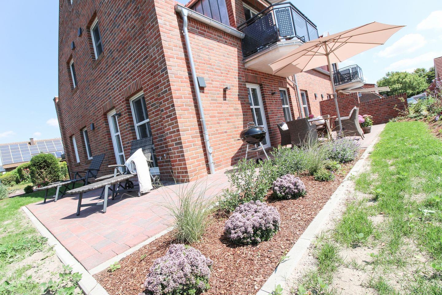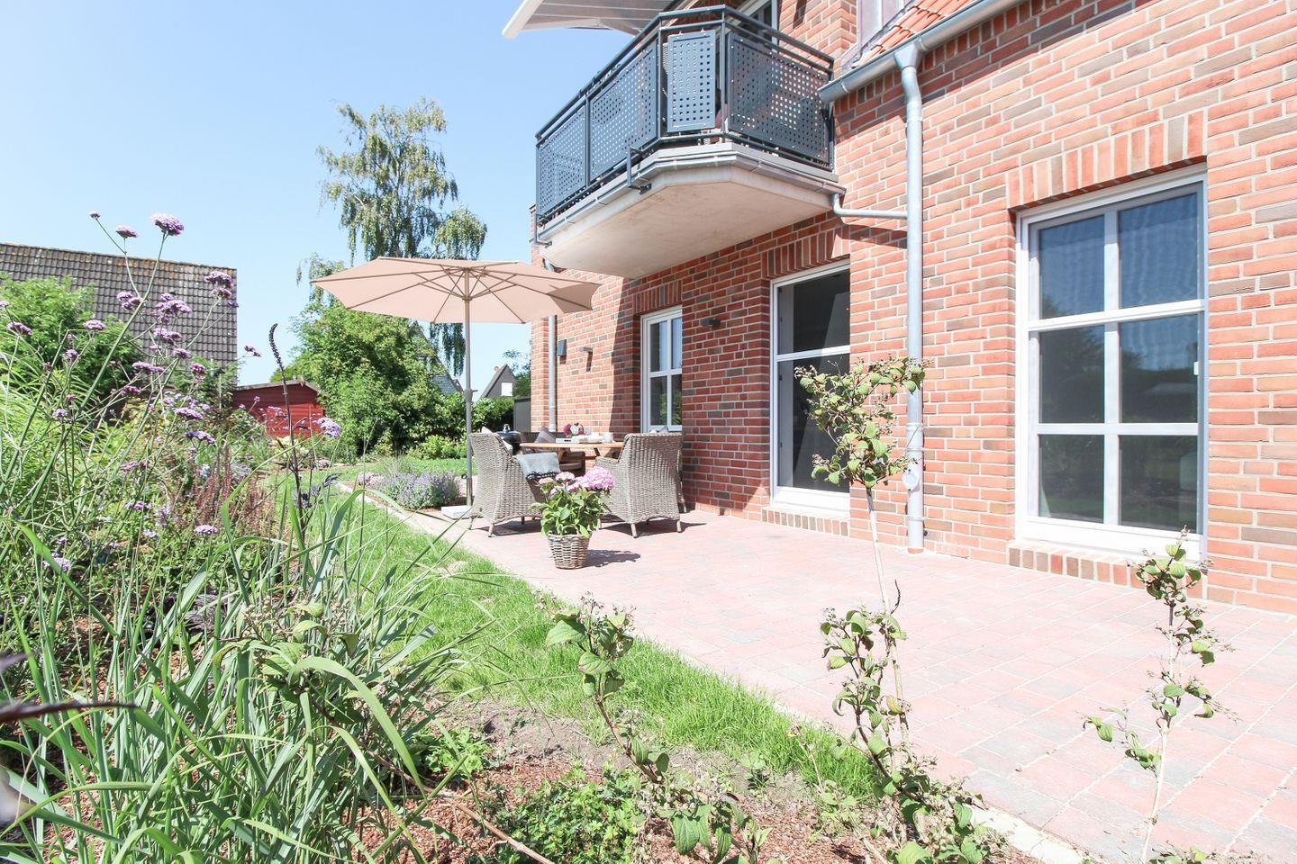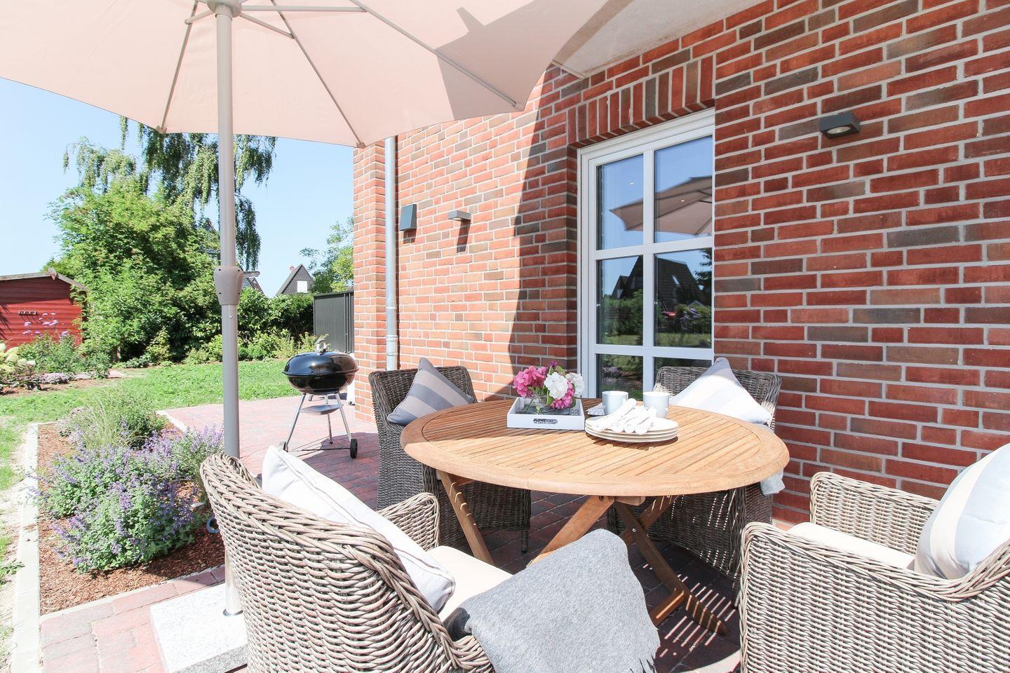 Der große Garten und drei Terrassen bieten Ihnen zahlreiche Möglichkeiten, die frische Nordseeluft zu genießen – ob beim Frühstück oder abends beim Grillen. Eine der Terrassen bietet direkten Zugang zum Wohnbereich und ist ideal für entspannte Stunden im Freien.
