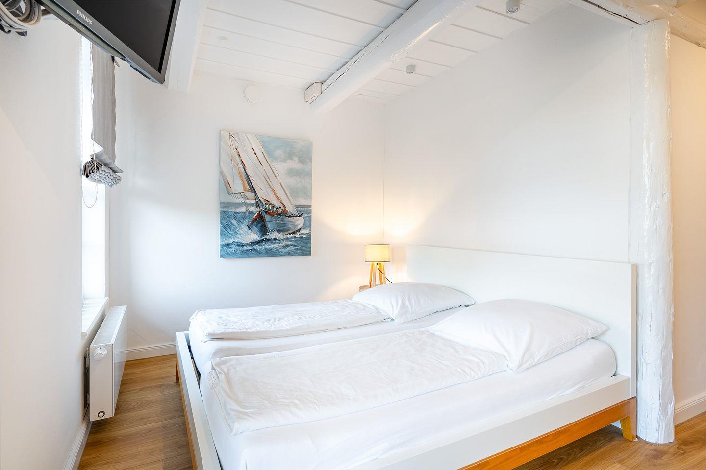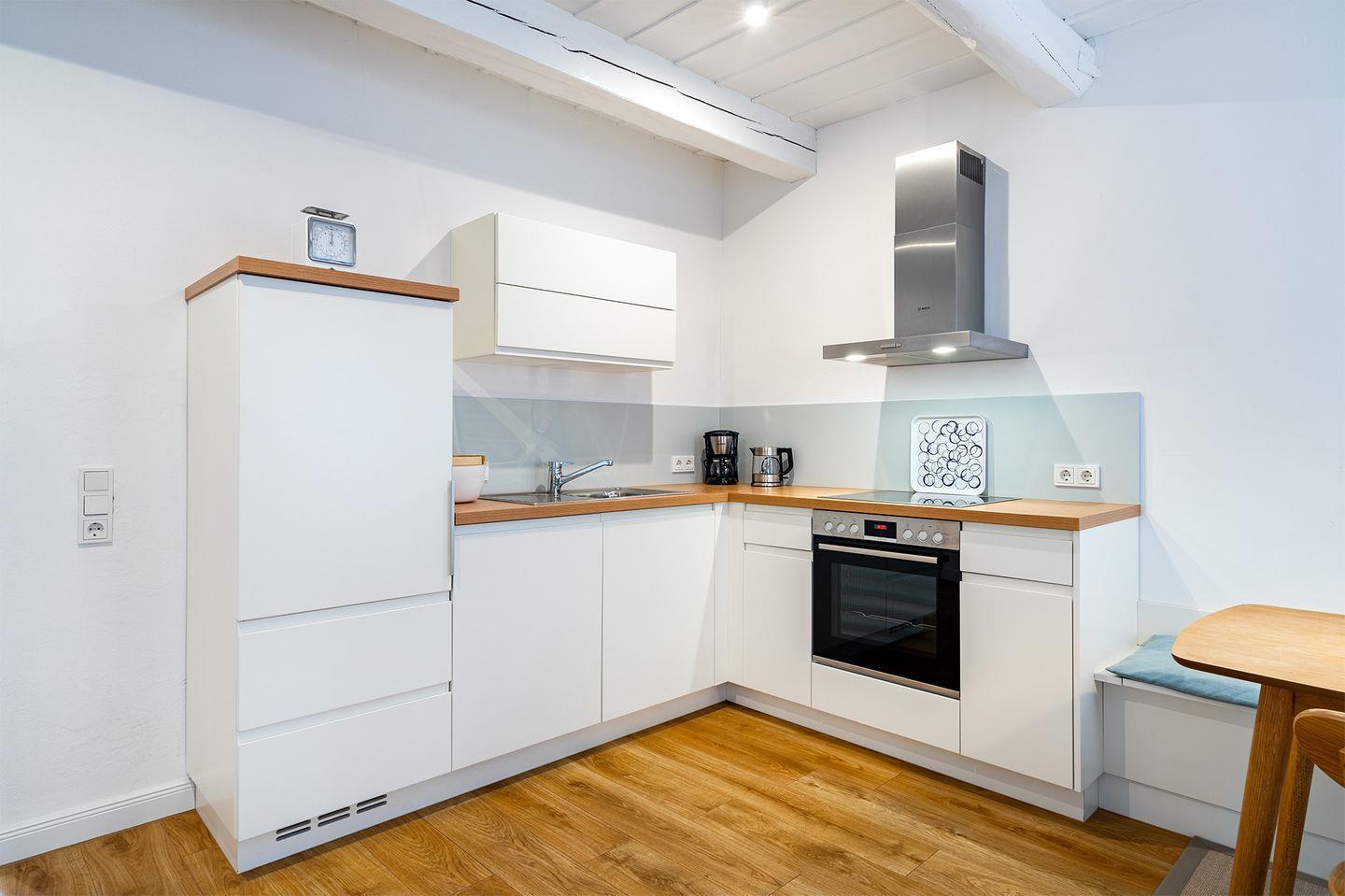Die Wohnung im Erdgeschoss verfügt über einen offenen Wohn- und Schlafbereich. Genießen Sie morgens im Bett einen Kaffee und blicken Sie dabei auf das Wasser. Die moderne weiße Küche ist komplett ausgestattet, sodass Sie problemlos einen Kochabend verbringen können. An der Eckbank können Sie gemütlich frühstücken oder Abendessen und das Treiben im Kattrepel beobachten.