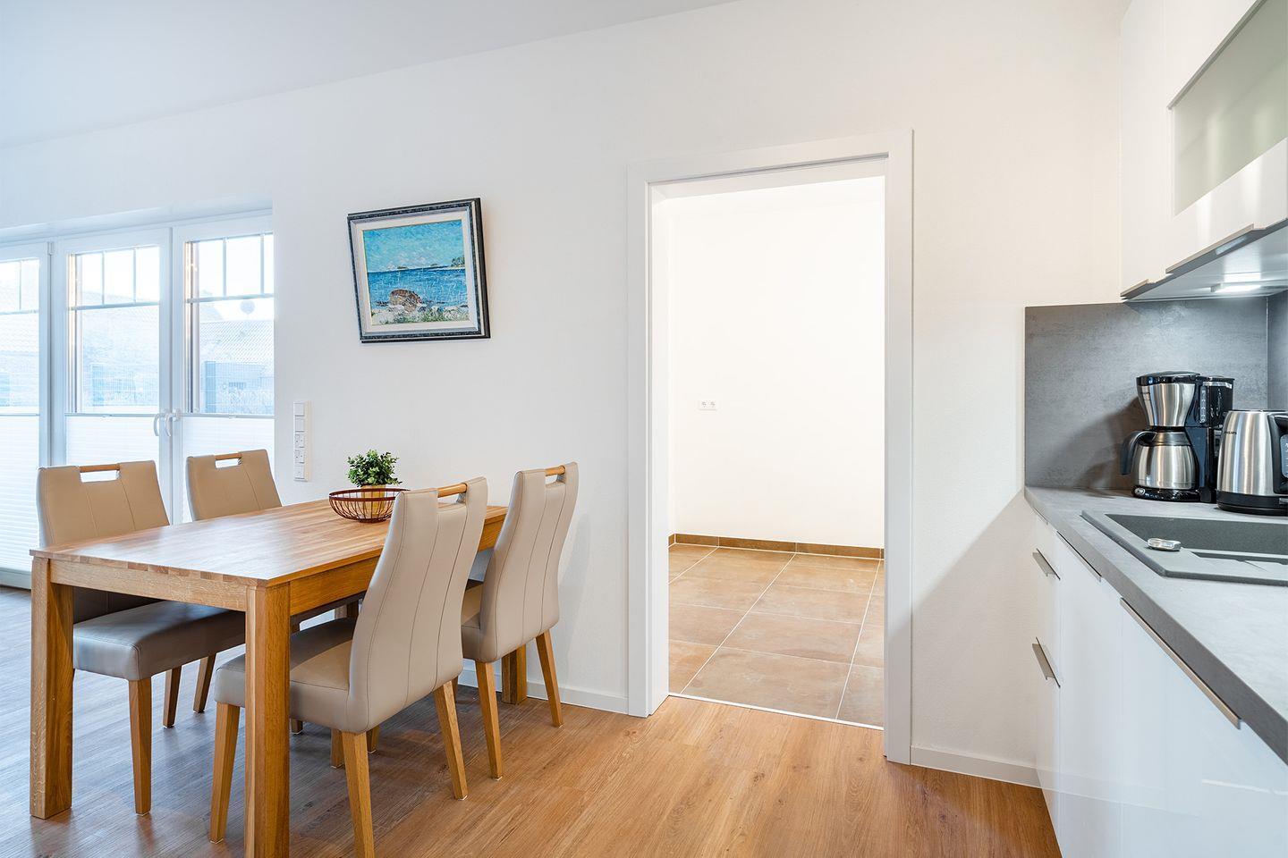 Moderne Erdgeschosswohnung in Greetsiel mit Terrasse, E-Bike-Ladestation und komfortabler Ausstattung für entspannte Urlaubstage.