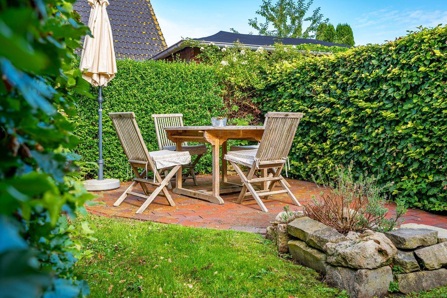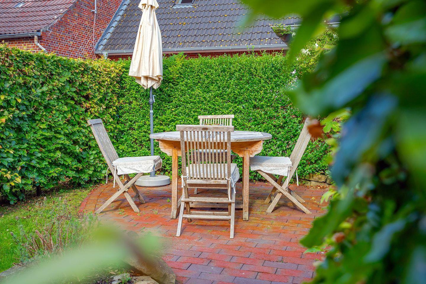 Vom Wohn- und Essbereich gelangen Sie auf die kleine Loggia, von der aus Sie einen schönen Blick auf die Mühlenstraße und das Geschehen in Greetsiel haben. Alternativ können Sie sich auf der Terrasse im eigenen Garten entspannen und den Tag genießen.