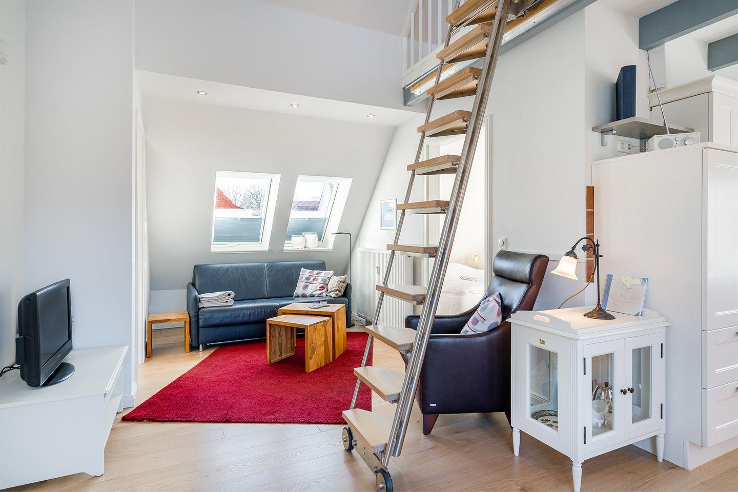 Für zusätzliche Schlafmöglichkeiten steht Ihnen ein ausziehbares Bett auf der Empore zur Verfügung, von dem aus Sie einen schönen Blick auf die Zwillingsmühlen genießen können.