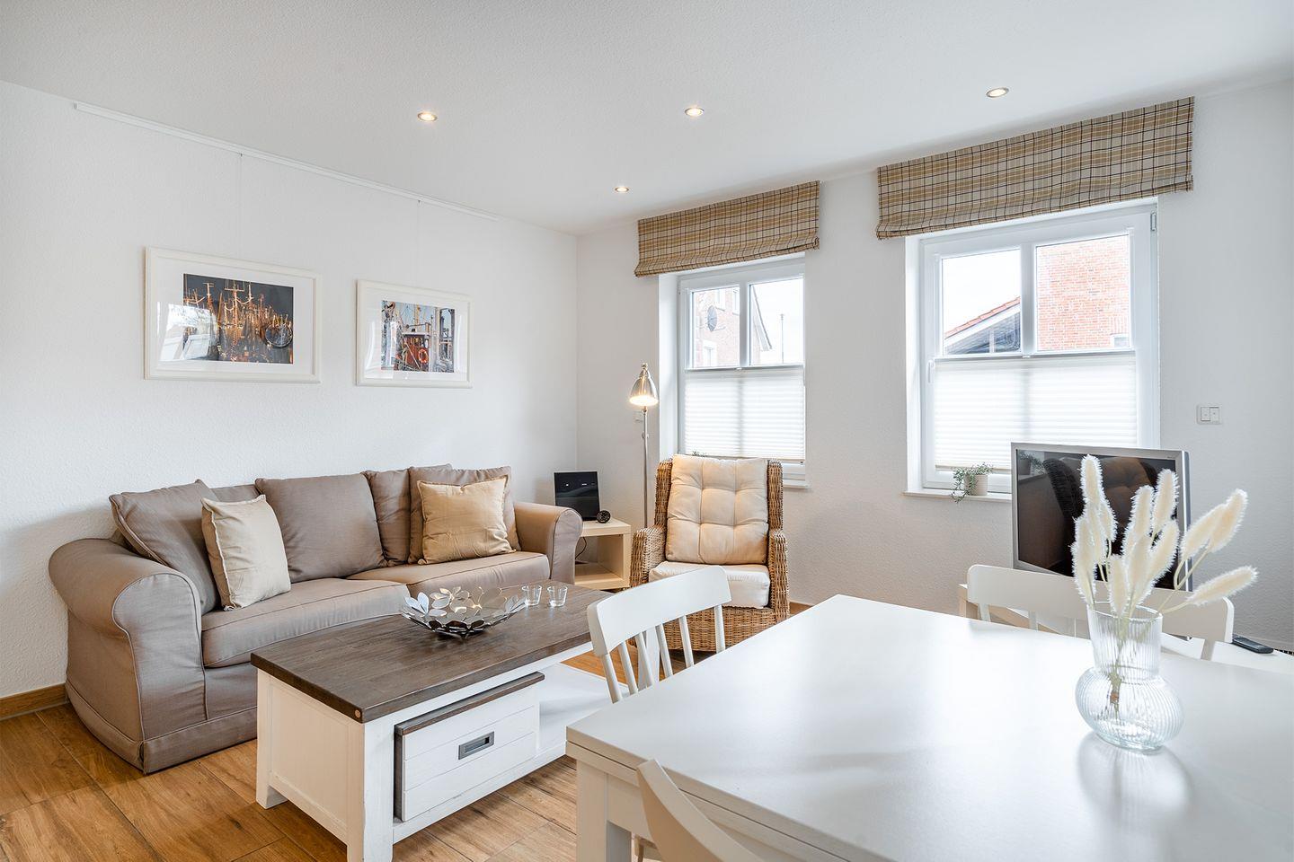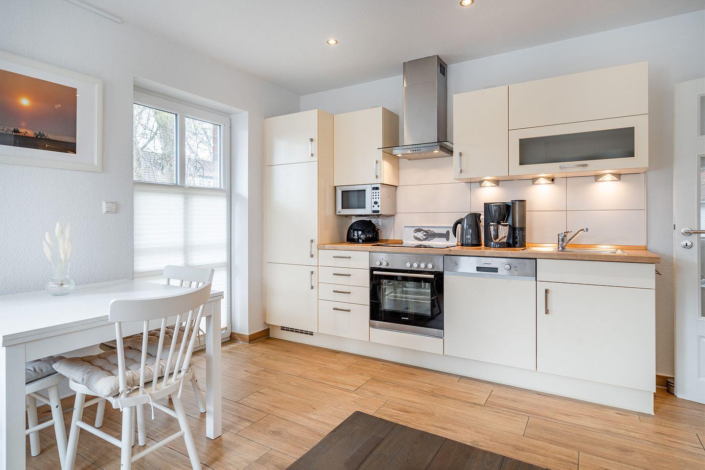 Der offene, gemütliche Wohn-Essbereich ist mit einer modernen Küche und einem TV ausgestattet. Hier finden Sie alles, was Sie für einen entspannten Urlaub benötigen. Durch die bodentiefen Fenster wird der Raum lichtdurchflutet und schafft eine angenehme Wohlfühlatmosphäre. Direkt vom Wohnbereich aus haben Sie Zugang zur Terrasse und dem kleinen Garten, der im Sommer zum Entspannen und Verweilen einlädt.