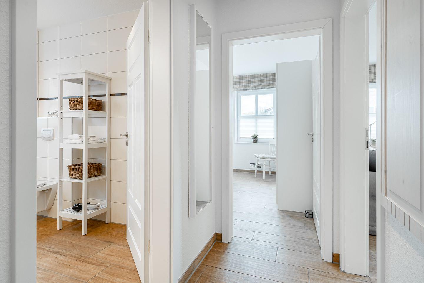 Das moderne Bad verfügt über eine bodengleiche begehbare Dusche und alle weiteren Annehmlichkeiten, die Sie benötigen, um sich morgens frisch zu machen und zu entspannen.