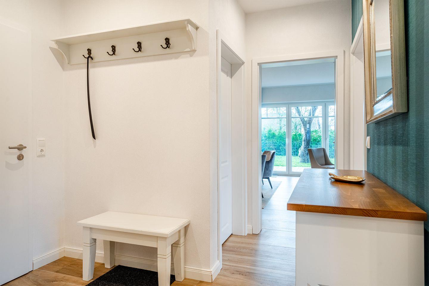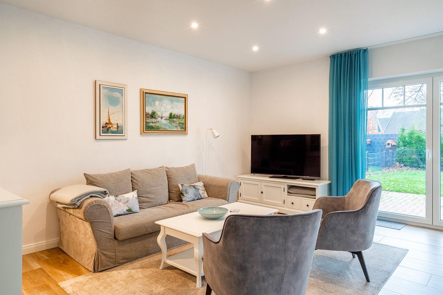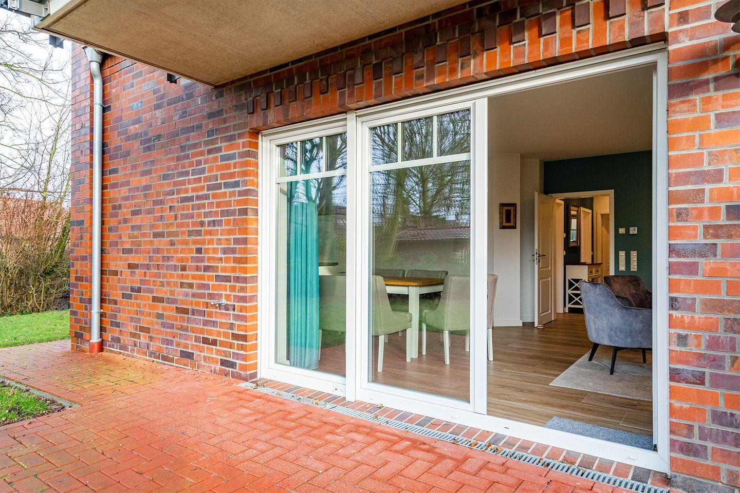 Moderne Erdgeschosswohnung am Hafen in Greetsiel mit Terrasse, E-Bike-Ladestation und Komfort für erholsame Urlaubstage.